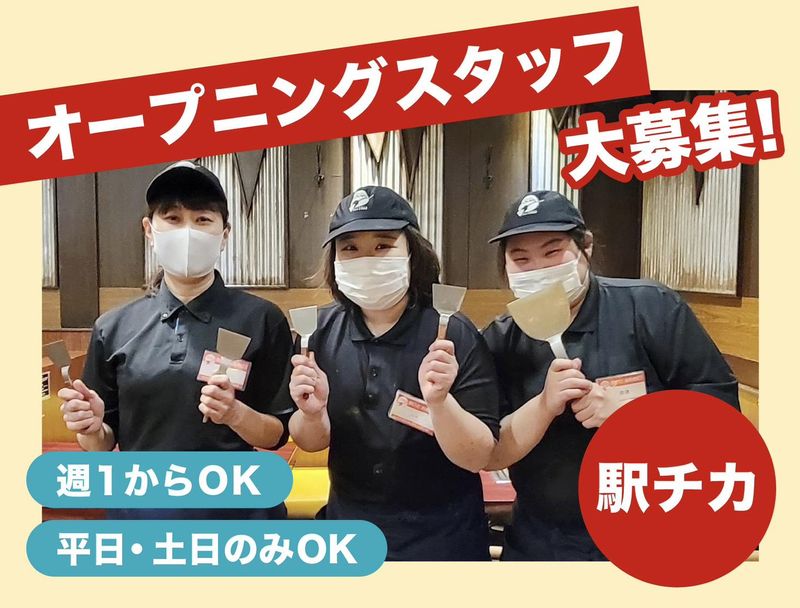 仕事内容 \大阪駅・KITTE大阪に新店オープン/ \オープニングスタッフ大募集!/ “1期生”として一緒にお店づくりをしませんか? 《ホールスタッフ》 ◆お客様のご案内 ◆オーダー取り ◆料理・ドリンクの配膳 ◆お会計 ◆テーブルセッティング etc... 新店だからスタートはみんな一緒! まずは元気よく「いらっしゃいませ!」 が言えればOK☆ バイトデビューも大歓迎♪ 《キッチンスタッフ》 ◆盛り付け ◆お好み焼き調理の補助 ◆洗い物 etc... 包丁を持ったことがなくても大丈夫! まかないを作りながら、少しずつ覚えていけます。 早い方なら1ヶ月ほどで一通りのスキルを習得可能◎ 【ポイント】 ■駅からすぐの好立地 ■新店だからこそポジションも自由に選べる! ■みんな一緒のスタートで安心♪