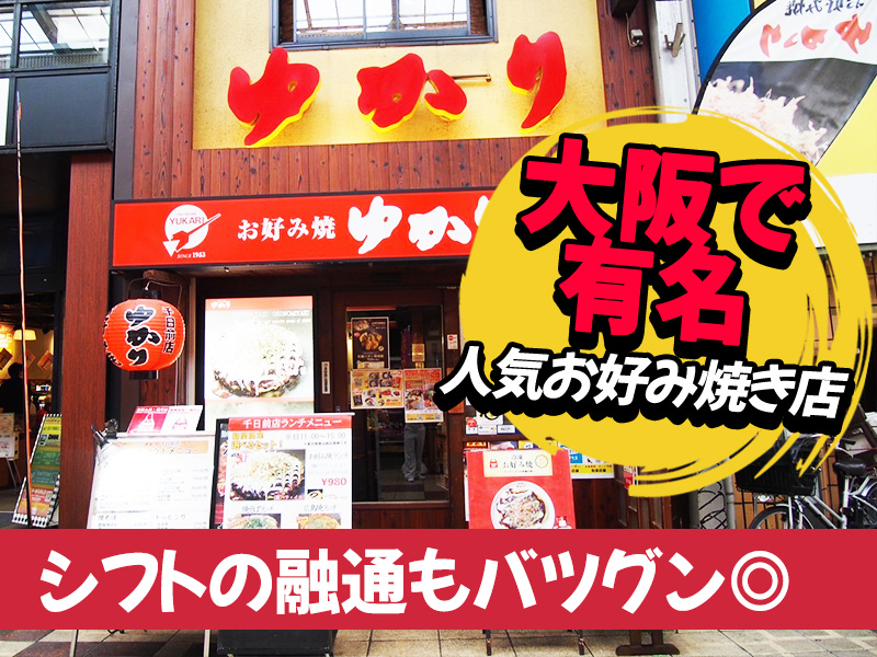 選考プロセス 面接は手ぶらでOKです!(履歴書は不要) ※面接は基本1回のみ 面接は《人柄重視》の面接となりますので、 ラフな格好でリラックスしてお越しください! ※お好み焼きゆかり KITTE大阪店は、 親会社である 株式会社ゆかりが代表して掲載し、 応募管理・面接調整を実施しています。 【面接地・登録地】 お好み焼ゆかり 曽根崎本店 所在地:大阪府大阪市北区曽根崎2-14-13