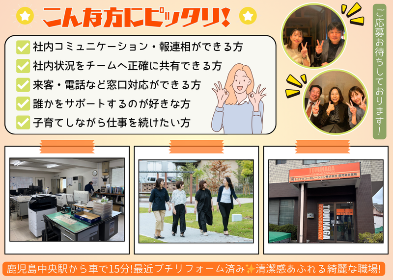 仕事内容 \働きやすさ◎!子育て世代も応援!/ ✨【街づくりを支える事務スタッフ募集】✨ 「家庭と両立しながら、誰かを支える仕事がしたい」 そんな方にぴったりのポジションです! ✅当社で働く魅力! ✨平日勤務・週3日からOK! 朝はゆっくり出勤&夕方にはお仕事終了!土日祝はしっかりお休み♪ 残業ほぼなしで、お子さまの送り迎えや家事とのバランスも取りやすい勤務体制です◎ ✨経験を活かして働けます! Excel、Wordの基本操作ができればOK! 最初は簡単な業務からスタートするので、わからないことも気軽に聞ける環境です◎ ✨県認定の「子育て・介護応援企業」 子育て中のスタッフも多数活躍中! 家庭の都合にも理解があり、社内も穏やかで、お互いを思いやるあたたかい雰囲気があります◎ ✨マイカー通勤OK&無料駐車場あり! 天候に左右されず通勤もスムーズ♪ 生活スタイルに合わせた働き方が可能です◎ ✅仕事内容 私たちトミナガコーポレーションは、道路標識やサインの製作を手がけています。 高速道路や一般道の標識は種類が多く、厳しい規格に沿った正確な製作が求められます。 当社では、標識の製作から設置工事まで、高い技術力と確かな品質で対応しています! 今回募集するのは、全国の街づくりを支える安全施設部門のサポート事務です! メンバーが外回りに集中できるよう、社内から支える大切なポジションです。 ≪具体的な業務内容≫ ◆電話対応 ◆来客対応・お茶出し ◆荷物の受け渡し(営業不在時) ◆データ入力 ◆工事写真の台帳作成(住所入力など) ◆請求書関連業務(本社とのやり取り) ◆小口現金管理 ◆伝票処理 ◆備品の買い出し ◆銀行対応 など 専門スキルは不要!最初はできる業務から少しずつお任せするのでご安心ください♪ ✅スタッフTさんにインタビュー! Q:入社のきっかけを教えてください! A:中学受験を控えた娘との時間を大切にしたいと考え、前職(出版関係)を退職しました。 専業主婦になるつもりでいたところ、前社長と知り合いだった友人から「今ちょうど人を探している」と声をかけてもらい、入社しました。 子育て中であることも理解していただき、「勤務時間は好きに、無理なく働ける時間帯でいいよ」と言ってもらえたのが大きな決め手でした。 Q:入社後の印象は? A:とにかく「人の温かさ」を感じました。 家庭の事情や子どもの都合にもとても理解があり、無理のない範囲で働かせてもらえる環境です。 当時、娘のお迎えがあり、残業はできないことを理解したうえで、きっちり退勤できるよう配慮してもらっていました。 Q:仕事のやりがいは? A:ただの事務作業ではなく、現場スタッフや営業メンバーを支え、街づくりに関わる仕事をバックオフィスから支えている実感が持てるところです。 自分が対応した書類や手続きが工事のスタートにつながったり、「助かったよ」と声をかけてもらえたりすることも多く、チームの一員として役に立てていると感じられます。 また、業務の進め方を工夫して効率が上がったときなど、自分のアイデアを仕事に活かせるのもやりがいの一つです。 Q:トミナガコーポレーションで働く魅力は? A:一番の魅力は「人の良さ」と「自由度の高さ」ですね。 会社としての制度以上に、社員一人ひとりの状況に寄り添ってくれるあたたかい文化があります。 家庭の事情も柔軟に対応してくれて、学校行事や体調不良でも休みやすい。やりたいことがあれば、支社長や上司が「やってみたら?」と応援してくれるのも大きな魅力です。 Q:社内の雰囲気は? A:とても落ち着いていて、穏やかな雰囲気です。 穏やかな人柄の方が多く、強く自己主張するよりも、お互いに思いやりをもって仕事を進めています。 だからこそ、ギスギスした空気もなく、長期で安心して働ける職場です。 Q:どんな人が向いていると思いますか? A:真面目で思いやりのある方なら、どなたでも馴染めると思います。 特に、子育て中でフルタイムは難しいけれど「何かしら仕事は続けたい」「社会とのつながりを持ちたい」と思っている方にはぴったりの環境です。 最初から高度なスキルは必要なく、むしろ、まわりと協力しながら丁寧に仕事を進められる方が向いていると思います! Q:求職者へ一言! A:「家庭と両立したいけど、働くのはあきらめた方がいいのかな」と悩んでいる方にこそ、来てほしい職場です! 私自身、子どもの成長に合わせて働き方を少しずつ変えながら、気づけば18年も働き続けてきました。 家庭を大切にしながら、やりがいと誇りを持てる仕事ができます! ぜひ一緒に働きましょう!お会いできるのを楽しみにしております♪