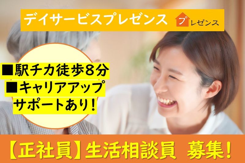 【仕事内容】 デイサービスプレゼンスの生活相談員を募集! あなたの「聴く力」が、誰かの笑顔に変わる。 寄り添う気持ちが、信頼を生みます。 デイサービスプレゼンスで、地域と人をつなぐ仕事をしませんか? デイサービスプレゼンスはリハビリを中心に定員10名の地域密着型通所介護を行っています。 リハビリは、食事の準備・片付け、掃除、歩行訓練などの日常動作をメインにサービス提供しています。 株式会社PRESENCEは、横浜市発の「みんなにやさいしい介護のプロを目指す」プロジェクト2018、2019年に受賞された認定事業所です。 【具体的な仕事内容】 ●相談員業務 ・ご利用者様のご利用手続き(契約、担当者会議など) ・ケアマネやご家族との連絡調整 ・ご利用者様やご家族の相談対応 ・施設のスタッフや地域との連絡 ・送迎業務 など 【デイサービスプレゼンスの魅力】 ===================== 若い世代が活躍しやすい環境 ===================== 30代以下を中心に幅広い年代層の職員がいるので、同年代での意見交換はもちろん困った時はベテランの職員に相談することも出来ます。 ========================== 業務効率ツールで手書きの手間を削減 ========================== 業務上の入力作業はiPadを使用して手書き作業の負担を軽減しています。 ========= 駐車場無料 ========= マイカー通勤・バイク通勤が可能で、駐車場も無料でご利用いただけます。 ==================== 資格取得支援・独立支援あり ==================== 介護初任者研修、介護福祉士、ケアマネジャーなどの資格取得や、起業や独立を目標にしている方を支援します。 =================== 職員の生活を支援します =================== 子育て中の方への支援をはじめ、生命保険や不動産、相続関係、親族の方の介護など、職員のサポートをしています。 ぜひご応募くださいね。 いきなりの面接は不安な方には施設見学も大歓迎です。 働き方の相談や、仕事内容のご質問などのお問合せもお気軽にご連絡ください。