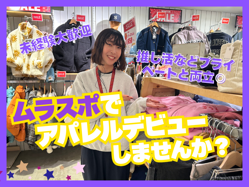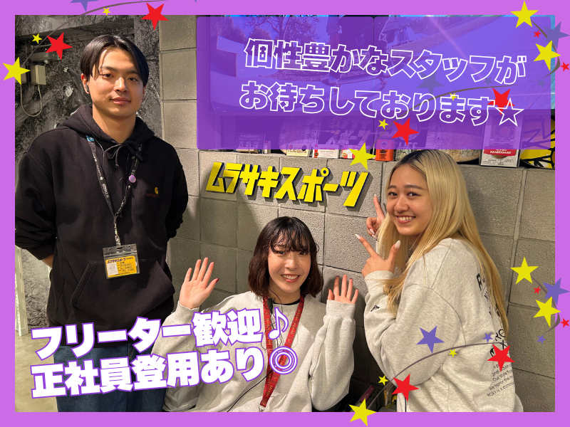 仕事内容 \ フリーターさん歓迎! /  ̄ ̄ ̄ ̄ ̄ ̄ ̄ ̄ ̄ ̄ ̄ ̄ ̄ ̄ ” ムラサキスポーツ ” で あなたの「好き」を仕事にしませんか? 全国100店舗以上!スポーツ用品・カジュアルウェアブランドで働く仲間を大募集! 【お仕事内容】 ✅お客様対応全般 ✅売り場レイアウト・ディスプレイ作成 ✅商品陳列、在庫チェック、レジ業務 ✅レディース水着の接客・販売 ✅アパレル・古着商品の販売・管理 ✅スノーボード関連アイテムのご案内など ✨このお仕事のここが楽しい!✨ ◆「売り場を任せてもらえる」こと♪ 入店から約1か月ほどで、自分の担当売り場を持てます。 配置や見せ方を考えて、お客様の反応を直接感じられるのがやりがいです♪ ◆好きなものに囲まれて働ける♪ スポーツブランド、アパレル、水着、 アウトドア、古着、スノーボードアイテムなどなど… 毎日トレンドに触れながら働けるので、 自然と知識もセンスも身につきます。 ◆おしゃれ自由!自分らしく働ける♪ 髪色・ネイル・ピアス自由!制服貸与★ あなたの個性を生かしておしゃれを 楽しみながら働けます♪ しかも実は・・・ / \ ムラスポの中でも 当店だけの魅力が盛りだくさん⭐ \ / ★当店は、全国で唯一! 『古着』の取り扱いがあります♪  ̄ ̄ ̄ ̄ ̄ ̄ ̄ ̄ ̄ ̄ ̄ ̄ ̄ ̄ ̄ ★ムラスポ全店の中で 『水着』の販売全国ナンバーワン♪  ̄ ̄ ̄ ̄ ̄ ̄ ̄ ̄ ̄ ̄ ̄ ̄ ̄ ̄ ̄ ̄ 「古着が好き」「水着が好き」 「ちょっと気になるけど、専門店で働くのはハードルが高そう…」 「知識がないから不安…」 そんな方にこそ、ぜひチャレンジしてほしい環境です。 最初はスタッフがしっかりサポートするので未経験でもOK! 働きながら少しずつ商品に触れ、自然と覚えていくことができるので安心してください♪ また、品揃えもバツグンなので 商品を社割で購入できちゃうのも スタッフに大人気なポイントなんです✨