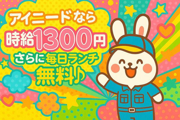 仕事内容 \企業内最高時給1300円♪毎日ランチ無料!洋食屋監修の日替わりメニュー4種類の中から選べます!/ アイニードは企業内最高時給1300円でお出迎え♪ ご家庭にある日用品を作っている大手メーカーさんの工場でのお仕事です。 弊社のスタッフさんは昼食時に選べるメニューのランチを全て無料で食べる事が出来ます☆彡 時給も企業内最高の金額で設定、お仕事は通年通して無くなりませんので安定して働く事が出来ます☆ 夏と冬にプチボーナスも3年連続で支給しています(^^♪ :+:・-・:+:・-・:+:・-・:+:・-・:+:・-・:+: 【日用品ラップの製造サポート】 ・製品の芯になるロールの機械への補充 箱に入った芯を機械に投入。 ・製品が機械によってロールに巻かれている機械のチェック 目視検査によって製品に異物がないかチェック。 ・製品補助 段ボールを補充、機械の作動に異常がないか確認。 等々のお仕事をしっかりと一つ一つ行って頂きます。 :+:・-・:+:・-・:+:・-・:+:・-・:+:・-・:+: 【安心の教育サポート体制★職場見学も必ず行います★】 入社後3ヶ月~半年は研修期間となり、本人のペースに合わせてしっかりお仕事を覚えていって頂きます。 教わっていない作業をお願いする事はありませんし、社員さんが必ず近くでサポートしてくれます。 入社前に必ず職場見学を行っていますので実際の現場を見る事が出来るので未経験の方でも安心してスタートする事が出来ます。 :+:・-・:+:・-・:+:・-・:+:・-・:+:・-・:+: \応募するならお早めに!/ こちらのお仕事は毎月入職できる数に限りがあります。 当月の予定数が埋まりますと次月の入社になってしまいますので応募はお早めにして頂ければと思います。 早くスタートしたい!という方は早い段階で応募で余裕をもってスタート出来ます☆ :+:・-・:+:・-・:+:・-・:+:・-・:+:・-・:+: 【困った時の日払い・週払い制度★★】 アイニードには給与の一部を日払い・週払いできる制度があります 残りの金額はお給料日にまとめてお支払い! 最短2日で受け取れますので 急な出費で困った時でも安心です♪ :+:・-・:+:・-・:+:・-・:+:・-・:+:・-・:+:
