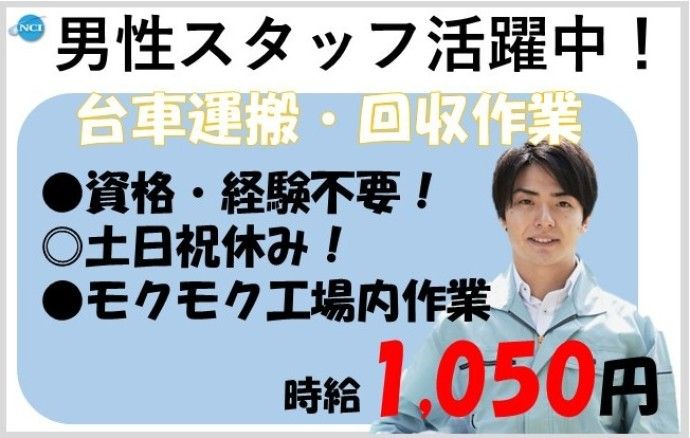 仕事内容 【 主な業務内容 】 ▼ヒーターやエアコンなどの家電部品の運搬作業がメインです! ・作業ラインへの部品の運搬 ・空き箱や空容器の回収 ※高さ170㎝程度のワゴンに部品を乗せて作業ラインまで運びます! ※作業ラインでの部品がなくならないように補充していきます! ※リストがあるので品番ごとに決められた場所に置けばOK! ================ ◎ココ見て!魅力ポイント◎ ================ ■完全日勤×土日祝休み! ■大手企業の安定シンプルワーク! ■覚えることが少ないから未経験でも安心! ■60代以上シニアの方も大活躍中! ============= ◎こんな方にオススメ◎ ============= ■難しい作業はしたくない! ■週末はしっかり休みたい! ■工場系の仕事に興味がある! ■年齢面でなかなか仕事が見つからない! ===ここもチェック=== ◇未経験者歓迎 ◇経験者歓迎 ◇フリーター歓迎 ◇U・Iターン歓迎 ◇第二新卒歓迎 ◇髪型・髪色自由 ◇学歴不問 ◇長期 ◇長期休暇あり ◇ブランクOK ◇家庭都合休OK ◇即日勤務OK ◇週4日以上OK ◇友達と応募OK ◇給料前払いOK ◇駅近5分以内 ◇残業月20時間以上 ◇40代以上応募可 ◇50代以上応募可 ◇60代以上応募可 =================