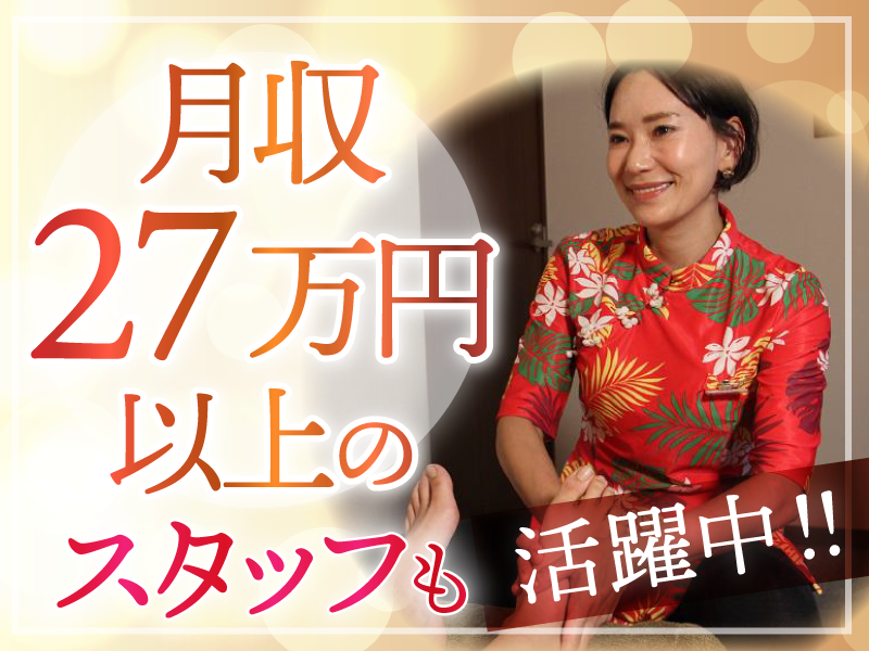 求めている人材 \本格台湾式リラクゼーション!/ 未経験から手に職をつけられる♪ 「セラピスト」のお仕事始めませんか? 経験を活かして、 即戦力となれる方も大歓迎です◎ ・リラクゼーションセラピスト未経験OK ・経験者優遇 ・主婦(夫)歓迎 ・ブランク歓迎 ・フリーター歓迎 ・学歴不問 ――――――――――――――――――― <こんな方も…みんな大歓迎◎> ◆家事や育児と両立して働きたい! ◆安定した環境で働きたい! ◆しっかり稼ぎたいフリーターさん! ◆掛け持ち・Wワークをお探しの方! etc. ――――――――――――――――――― <経験者の方も大歓迎!> 「ヘッドマッサージ等の経験を 活かして、即戦力として働きたい」 「足裏マッサージ等の経験を 活かしつつ、もっとスキルや技術を 磨きたい」 「昔アロママッサージ師として 働いていた経験を活かして ブランク復帰したい」 …という方等にもオススメです♪ ――――――――――――――――――― \\ 先輩スタッフの声 // たくさんの「体と心の変化」を 実感しています! ●以前は事務職でしたが、 今は毎日無理なく体を動かし、 自然と汗をかくように! そのおかげで、以前より風邪を ひきにくくなったと感じています。 ●働いている間に、体幹が 鍛えられてきたような実感もあります! 日々の生活の中でも、 以前よりテキパキ動けるようになり、 筋力もついた気がします! ●毎日温泉に無料で入れるため、 光熱費がかなり抑えられ、 お肌トラブルもなくなりました! ●お客様と会話をしながら接客を行うことで、 気分転換にもなり、以前よりストレスを 溜めにくくなりました! ●ずっと座りっぱなし、または ほとんど動かない仕事を していた頃よりも、 今はぐっすり眠れるようになり、 ご飯もより美味しく感じます! ―――――――――――――――――――