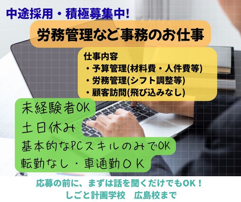 人気の事務『労務管理等』のお仕事未経験者の方もOK/基本的なPCスキル土日休み/残業月20時間程度