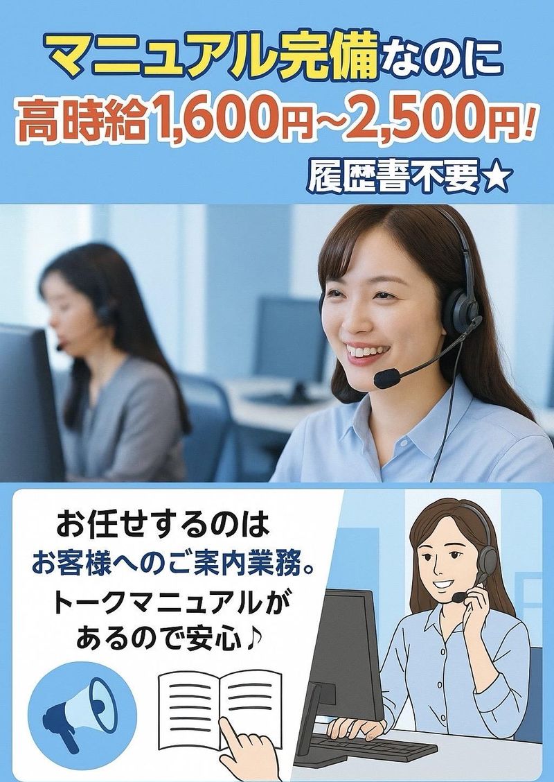 仕事内容 ✨アピールポイント✨ ✅【簡易エントリー】面倒な応募入力なし! ※エントリー後に候補日メールが届くので返信して下さい♪ ✅高時給の1,600円~2,500円★ ✅履歴書なし応募もOK ✅年末年始お休みあります♪ ✅シフト自由!週3日、1日h~OK! ✅髪色・髪型・服装自由◎ 未経験大歓迎!ノルマなし◎ 週3日、1日5時間~OK! 手厚いサポートで安心デビュー♪ 20代~40代スタッフ活躍中◎ Wワーク、扶養内勤務もOK! \ 難しい業務はほとんどありません。 お店に削減の提案の 簡単なアポ取りのお仕事なので、 お客様の有益になる情報だから アポがとりやすいんです♪ アポがとれたら営業にバトンタッチ! 経験者の方なら即戦力として働けます◎ マニュアルや台本なども完備!! 手厚いサポート体制も充実していますので、 未経験の方でも安心して 業務をスタートできます◎ ★ … ★ … ★ \\ 働く魅力を紹介 // ⇒POINT 1 #シフト自由 #柔軟シフト #ライフスタイルに合わせて 週3日、1日4時間からOK! シフトの調整が可能で、 ライフスタイルに合わせた働き方が可能◎ ●勤務時間例 10:00-16:00 10:00-17:00 14:00-18:00 10:00-18:00 週3~OK! 週20時間以内勤務もOKです! ⇒POINT 2 #充実の研修 #先輩スタッフサポート 未経験でも安心!研修制度充実◎ わからないことは 先輩スタッフがサポートしてくれます♪ 20代~40代のスタッフ活躍中! ⇒POINT 3 #高時給1,600円~2,500円 #未経験でも安心 未経験からスタートして、 しっかり稼げる高時給! 成果に応じてインセンティブも支給され、 やりがいやモチベーション高く働けます♪ ノルマも無いので安心◎ 【月収例】 ▼2,500円計算 週4日/1日8時間勤務/16日 ⇒320,000円+インセンティブGET! ▼1,600円計算 週4日/1日8時間勤務/16日 ⇒204,800円+インセンティブGET! 頑張りしだいで、時給UP★ 頑張りはしっかり評価します!! ⇒POINT 4 #カラー、パーマOK #ピアス、ネイルOK #服装自由 #オシャレに働く毎日 #社内旅行参加可能 今の時代に合ったスタイルで働けて 旅行も自由参加可能です! ※海の写真は沖縄♪ ★ … ★ … ★ \\ 安心して働ける環境を提供 // スタッフ同士のチームワークを大切にしています! 働く仲間はみんな仲良し♪ 休憩時間等みんなでご飯に行くなど、 コミュニケーションも活発です! 一生モノの友達もココで作れちゃうかも♪ #高時給&シフトも柔軟◎ 自分らしく働けるので、 プライベートも大切にしながら、 仕事に取り組みたい方にぴったり! 少しでも興味を持ったら、 ぜひご応募ください お待ちしています!