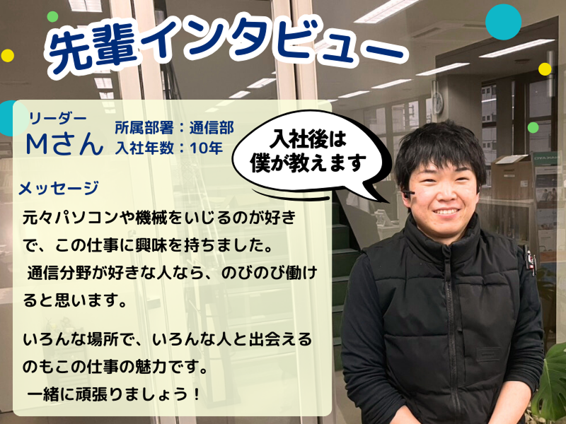 アピールポイント: ◆代表メッセージ  ̄ ̄ ̄ ̄ ̄ ̄ ̄ ̄ ̄ ̄ ̄ ̄ はじめまして、 中央電設株式会社 代表の中山と申します。 私は、社員に対して多くを語るタイプではありません。 ほどよい距離感を大切にしています。 というよりも、正直に言うと、 積極的に声をかけていくのは苦手なんです^^; ただ、頑張っている姿はちゃんと見ています。 良い仕事をしてくれたら、その分は給料や賞与で きちんと返したい。 それが経営者としての責任だと思っています。 伸びたい気持ちがある人、 技術を身につけて長く働きたい人には、 しっかり応える会社です。 お会いできることを楽しみにしています。 ◆当社について  ̄ ̄ ̄ ̄ ̄ ̄ ̄ ̄ ̄ ̄ ̄ ̄ ̄ 中央電設株式会社は、 通信設備と消防設備を扱う会社です。 私たちは、ネットワーク設備から 火災報知・非常放送まで、 暮らしと命を支えるインフラ設備工事を行っています。 そして当社のいちばんの強みは、 職人を自社で抱えていること。 「困った時に頼れる会社」として、 確かな技術とスピード対応を評価されています。