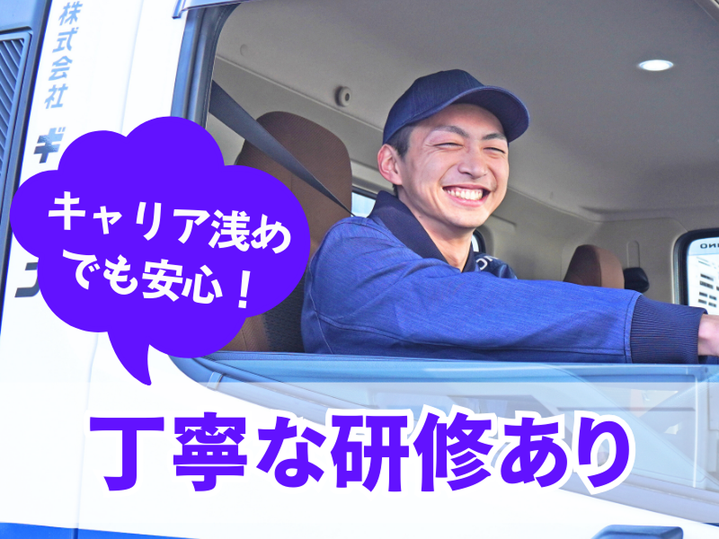 アピールポイント: \大手ならではの待遇が自慢!/ ◆休みが多い! 年間休日は120日! 業界トップクラスの多さです! 有給取得率も90%と、 プライベートの時間もタップリあります♪ ◆しっかり稼げる! 入社直後から月収30万円稼ぐ人がたくさん! さらに ・賞与年2回 ・昇格査定年1回 と、 高収入を目指せる仕組みが整っています◎ \ていねいな研修あり!/ 座学研修のあとは先輩のトラックに同乗し、 1日の流れやルートをレクチャー。 一人ひとりのペースに合わせて進めるので ブランクがある方もご安心ください◎ \キャリアアップも可能!/ 全国各地で拠点を増やしているギオン! 管理職ポストはどんどん増加中♪ 昇進チャンスは多数あります! 新卒・第二新卒の若手から30代・40代・ 50代のミドル・中高年まで活躍中! 幅広い世代がのびのび働いています♪ ------------------