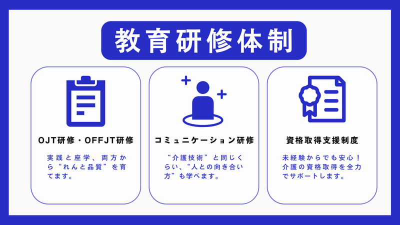 求めている人材 【必須条件】 ・以下の資格のいずれかをお持ちの方、もしくは取得予定の方 介護職員初任者研修(旧ホームヘルパー2級) 介護福祉士実務者研修 介護福祉士
