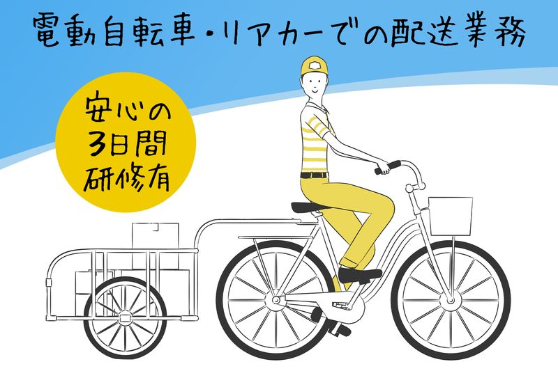 仕事内容: ■拠点から5キロ圏内の配達先へ電動自転車(リアカー付き)での荷物配達 もちろんですが「経験不要」「運転免許不要」、、、スグに始められるお仕事です!! 日により変動はありますが1日「40~120個」の荷物を配達頂きます。 (変更の範囲)雇い入れ直後の従事すべき業務と同じ
