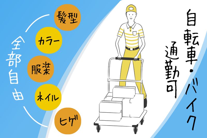 求める人材: ■学歴不問 ■未経験歓迎 ■週3日以上勤務できる方 ■1日フルタイム勤務が可能な方(実働10時間) ■人と接することが好きな方 ただ配達をしていればいい。その考えの方は弊社には向きません。 笑顔を忘れずに荷物をお渡しすること、支店のメンバーと コミュニケーションを積極的に取り、助け合うこと。 これができる方を求めています。