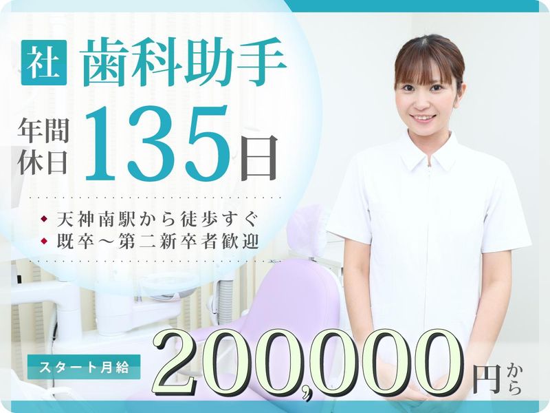 仕事内容 / 実務未経験者歓迎!ブランクOK! 1ヶ月の丁寧な研修ありで安心 \ :::::::::::::::::::::::::::: 求人のアピールポイント :::::::::::::::::::::::::::: ❏完全予約診療で落ち着いて診察できる ❏残業ほぼなし ❏実務未経験者歓迎!ブランクOK! ❏土・日・祝日休み/週休平均2.5日 ❏年間休日135日 ❏昇給・賞与あり◎社保完備で安心 ❏駅徒歩2分で通勤ラクラク ❏年末年始・夏季休暇共に10日前後あり! ❏休憩室、更衣室(ロッカー)あり ❏お産休暇(産前産後休業)あり 【仕事内容】 ▼歯科医師、歯科衛生士の補助全般 ・治療器具の準備や管理 ・医師の診療補助やサポート業務 ・院内の清掃や消毒 など 1日の患者さんの数は15-20人程です。 【研修について】 試用期間は1ヶ月(同条件)を予定。 一から丁寧にお教えするので、 実務未経験者やブランク明けの方も 安心してスタートできる環境です* 研修期間は目安なので、覚えるまで しっかりとサポートします。 【こんな歯科医院です】 福岡市中央区に位置する歯科医院です。 アクセスも良好で、最寄り駅から徒歩2分と 通勤にも便利な立地です。 当院では、患者さまにとって 「痛みの少ない治療」を大切にし、 矯正治療、審美歯科、インプラント治療など 幅広い診療に対応しています。 技術の向上はもちろんのこと、 患者さまとの信頼関係を築くことにも 力を入れています。