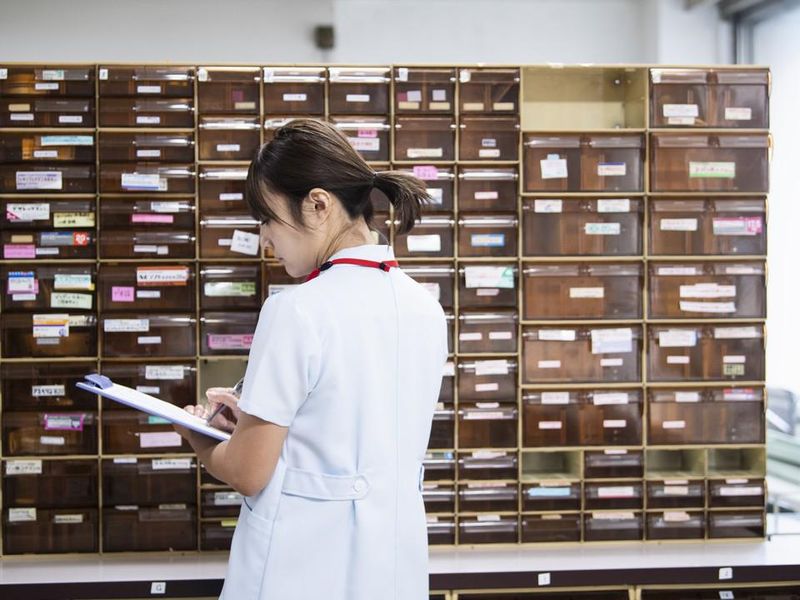 お薬を棚から選んで集めたり、運んだり。薬剤師さんのお手伝い