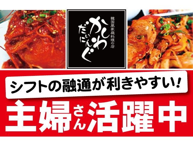 仕事内容 \宇都宮市/ランチのみ×短時間 韓国風家庭料理店ホールスタッフ(主婦さん活躍中) 宇都宮市の韓国風家庭料理店「かしわだいにんぐ」にて ホールスタッフ(パート・アルバイト)を募集します。 日本人夫婦が営むアットホームなお店で、落ち着いて働ける環境です。 ▼働きやすいポイント(主婦さんに人気) ・ランチのみ(10:00〜15:00) ・1日5時間の短時間パート ・週2日〜OK/自分のペースで働ける ・希望シフト制で家庭・学校行事にも柔軟に対応 ・扶養内勤務OK/ブランクOK/未経験歓迎 ・子育て世代・主婦パートさん中心に活躍中 ・マイカー通勤可/駐車場完備 ・美味しい賄い無料(韓国料理リクエストOK) 「子どものお迎えまでに働きたい」 「家事と両立しながら無理なく働きたい」 そんな方にぴったりです。 ▼主な仕事内容 ・料理の配膳 ・レジ対応 ・オーダーは端末で行うので簡単 ・洗い物など軽作業 メニューもシンプルで覚えやすく、 1〜2ヶ月で無理なく習得できます。 最初は簡単なお仕事からお任せするため、 飲食店が初めての方も安心です。 ▼勤務地(宇都宮市・鹿沼街道沿い) 宇都宮環状線から鹿沼街道との交差点を東へ進み、約500m左側。 周辺には喫茶店や飲食店も多く、 仕事終わりに寄り道もしやすい便利なエリアです。 ・駐車場あり ・車通勤OK ・通勤ラクラク ▼こんな方におすすめ ・韓国料理が好き、韓国ドラマやK-POPに興味がある ・家庭優先で働ける飲食パートを探している ・ランチタイム中心の仕事がしたい ・短時間・扶養内で働きたい ・未経験から接客スキルを身につけたい 明るくあたたかい雰囲気のスタッフばかりなので、 初めての方も安心して馴染めます ▼応募方法 まずはWEB応募よりエントリーしてください。 面接日程は追ってご連絡いたします。 具材たっぷりの美味しい賄い無料! ビビンバ・チゲなど、リクエストも歓迎です。