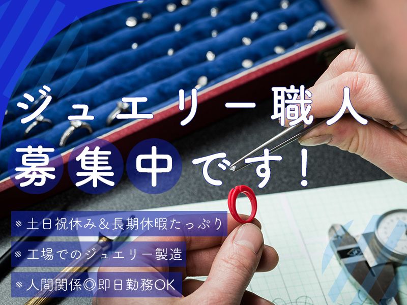 仕事内容 ━━━━━━━━━‥・ 【 未経験者歓迎 】 面接ではあなたの経歴よりも お人柄を重視します! ・‥━━━━━━━━━ \押さえておきたいPOINT/ ●未経験OKのものづくり業 ●昇給年1回&賞与年2回 ●完全週休2日制・年間休日120日~ ●GW・夏季・年末年始は各8日休み ●転勤なし&駅チカで通勤しやすい <仕事内容> 貴金属ジュエリー(指輪など)の 工場で製造業務をおまかせ。 以下4工程の中で配属が決まります。 ①ゴム切り ②ワックス成形 ③サイズ直し ④キャスト ※異動やヘルプもあり。 ※地金のカットなどがあるため ある程度の力仕事があります。 <風通しばっちり!> 同世代(20~30代)が集まり 和気あいあいと仕事しています!