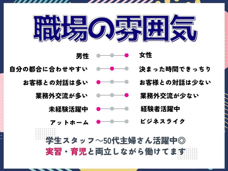 職場環境 大学生スタッフを中心に 20代~50代まで幅広く活躍中! ・看護学校に通う学生さん ・薬学部の学生さん ・本業の合間に働く主婦さん ・Wワークの社会人スタッフ いろんなスタッフがいるので 学校以外のつながりもできます♪