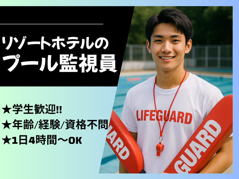 求めている人材 \✨年齢不問・経験不問・資格不問✨/ ☆学生歓迎! ☆未経験・初心者OK! ☆経験者歓迎!優遇します! ☆主婦・主夫歓迎/主婦活躍中! ☆フリーター歓迎/フリーター活躍中! ☆人をおもてなしするのが好きな方、 リゾートバイトに興味がある方歓迎! *||:||*||:||*||:||*||:||*||:||* プールでの監視スタッフ、 アミューズメント施設スタッフ、 ホテルフロントやホテルスタッフの 経験者、レジャーホテルなどで ホテル清掃の経験がある方、 主婦・主夫の方も大歓迎! ✨学生OKのリゾートバイトです♪ ✨新年度は新環境で迎えたい! そんな方も、ぜひご応募ください✨ *||:||*||:||*||:||*||:||*||:||*