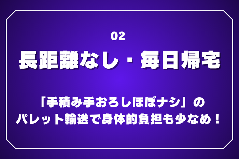 アピールポイント: ✨身体の負担「極少」!パレット輸送&近距離の定期便 大型トラックでありながら、積み降ろしはパレット主体で手積み手おろしはほぼナシ。 1日の走行距離も80〜90kmと短く、ルートも固定の定期便です。体力的な不安を感じることなく、長く安定して走り続けられる環境が整っています。 ✨「健康経営優良法人」認定!社員の安全と健康を徹底サポート 毎年「健康経営優良法人」に認定されるほど、社員の健康管理に心血を注いでいます。 人間ドックや脳ドックの無料受診ができるなど、福利厚生の充実は地域トップクラス。 地元紙にも取り上げられるほどの信頼と実績がある企業です。 ✨未経験・ブランクも安心!自社研修施設「訓練道場」完備 「免許はあるけど実務が不安」という方のための専用研修施設(訓練道場)を保有しています。 納得いくまで練習してから実戦デビューできるため、自信を持ってスタートできます。 女性の管理職兼ドライバーも在籍しており、性別を問わず活躍できる土壌があります。 ✨週末はしっかりリフレッシュ!「土日休み」で毎日帰宅 基本土日休みの週休2日制で、仕事の終わる時間も予測しやすいため、家族や趣味の時間を削ることはありません。 「毎日必ず家に帰れる」という、大型ドライバーとしては希少なワークライフバランスを実現できます。