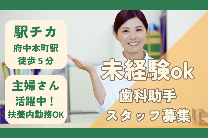 仕事内容 【 求人のポイント 】- ❒ アルバイトパート/歯科助手募集 ❒ 未経験歓迎!採用は人柄重視 ❒ 土曜含む週3日~OK! 午前シフト!8:30~13時勤務◎ ❒ 駅チカ!アクセス抜群で通いやすい♪ (府中本町駅・分倍河原駅・府中駅) ❒ 40代~50代主婦パートさん活躍中! ❒週3日勤務で月収は約70200円 週4日勤務で月収は約93600円 - 【 仕事内容 】 歯科助手業務全般をお願いします。 *具体的には… ・患者様の診療受付・ご案内 ・お会計業務 ・診療補助、器具の準備・消毒・滅菌 ・診療室の準備・片づけ ・クリニックの清掃・院内管理 など - 【 職場の雰囲気 】 40代~50代の主婦スタッフ活躍中! 当院のスタッフは、 子育てがちょっと落ち着いて、 家事と両立しながら働く主婦さんばかり! 少人数で和やかな雰囲気の職場◎ 仕事のことはもちろんですが、 シフトの調整についてなども スタッフ同士助け合いながら働いています。 院長をはじめ、優しく面倒見の良いスタッフばかりですので、きっと安心して働きやすい環境だと思います! ✓経験不問 ✓主夫・主婦歓迎 ✓フリーター歓迎! ✓家事とアルバイトパートの お仕事を両立したい方 ✓駅チカの職場で働きたい方 ✓医療業界の仕事に興味がある方