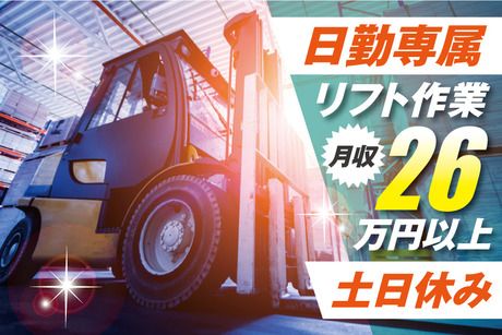 仕事内容 【仕事内容】 農業機械を扱う倉庫での入出荷のお仕事です! カウンターリフトを使った運搬作業が中心になります。 リフト作業が7割、その他の作業が3割くらいの割合です。 ブランクがある方や経験が浅い方も大丈夫! 丁寧なサポートがあるので安心してスタートできます。 「コツコツ作業するのが好きな方」 「集中して取り組むのが得意な方」 「リフトの運転が好きな方」にピッタリのお仕事です♪ 【職場について】 農業機械やディーゼルエンジンなどを扱う安定企業。 取引先は大手メーカーなので、安定した仕事量アリ! 「リフトの免許はあるけど、 しばらく使っていない…」という方も大歓迎! スキルを活かして働くシニア世代の方も在籍しています。 20代、30代、40代、50代、60歳までの男性活躍中! 【おすすめポイント!】 ・眠っているリフト資格、今こそ活かすチャンス! ・早めの退勤&休み充実。月収26円以上も目指せる◎ ・マイカー通勤OK!送迎バスもあるのでラクラク通勤♪ 【まずは派遣から。将来は正社員も目指せる】 「いずれは正社員として働きたい」という方に◎ 今回のお仕事は、派遣先企業または当社での 直接雇用・正社員登用制度あり(実績多数)! まずは派遣で無理なく慣れていき、 職場が合えば長く活躍できるチャンスも広がります。 若いスタッフも多く、馴染みやすい雰囲気なので、 将来を見据えて働きたいか方におすすめです。