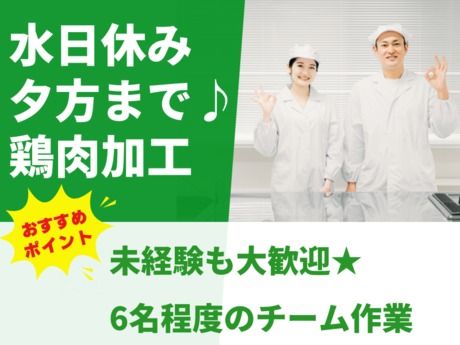 仕事内容 \ここがポイント/ ★日勤のみで生活リズム安定♪ ★6名のチーム作業で安心スタート! ★未経験歓迎♪かんたん軽作業! *・。・。*・。・。*・。・。* <仕事内容> \食品工場での鶏肉加工スタッフ♪/ 焼き鳥やおつまみでおなじみの「砂ずり」の加工を行います。 コンベアーで流れてくる砂ずりから、 薄皮を手やハサミを使って取り除く、 シンプルで覚えやすい作業です。 6名程度のチームで作業するため、 わからないことがあってもすぐに聞けて安心! 初めての方も、仕事をしながら少しずつ覚えていけます♪ 作業は立ち仕事になりますが、 リズムよく取り組めるのも魅力のひとつ◎ 勤務は日勤のみ&水曜・日曜休みで、 平日と週末の予定が立てやすく、 私生活とのバランスも取りやすい職場です! *・。・。*・。・。*・。・。*