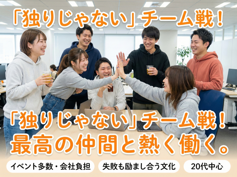 仕事内容 ✨仲間と一緒にトレンドを広める ✨遊びも全力な楽しいメンバー ✨未経験からPRのプロへ \チームワーク抜群の職場です/ SNSやWebを活用した 集客サービスのご案内をお任せ。 チーム全員で目標を追いかけます! 【具体的な業務内容】 ✅店舗様への電話アプローチ ✅PR企画のご提案 ✅チーム内での作戦会議 【入社後の流れ】 研修後は先輩とバディを組んで お仕事スタート。 一人じゃないから心強い! 失敗してもフォローし合う社風です。 契約が取れたらハイタッチ! 喜びを共有できる最高の仲間です。 ■採用担当者からのメッセージ 毎日笑いが絶えない職場です✨ 仕事終わりは飲みに行ったり 休日はみんなでBBQをしたり。 「会社に行くのが楽しみ」 そう言ってくれる社員が多いんです。 人間関係に悩みたくない方、 ここなら絶対大丈夫ですよ! 【✨入社者インタビュー】 ①元アパレル/入社1年目/24歳 髪色もネイルも自由で、毎日好きな服で働けるのが最高です。同世代が多いので、休憩時間は常に笑い声が飛び交っています。仕事というより、サークルの仲間と一緒に目標を追いかけている感覚に近く、毎日会社に来るのが楽しみです♪ ②元飲食店/入社2年目/26歳 以前は一人で黙々と作業する仕事でしたが、ここは全然違います。アポが一本取れるたびに、周りが「ナイス!」とハイタッチしてくれるんです。困った時はすぐに助けてくれる温かさがあり、チームで戦う楽しさを初めて知りました♪ ③異業種からの転職/入社3年目/32歳 最初は「20代中心のノリ」についていけるか不安でしたが、杞憂でした。変な上下関係がなく驚くほどフラット。仕事終わりにご飯に行ったり、休日に遊んだり。人間関係のストレスが一切なく、自然体で働けるのが魅力です。