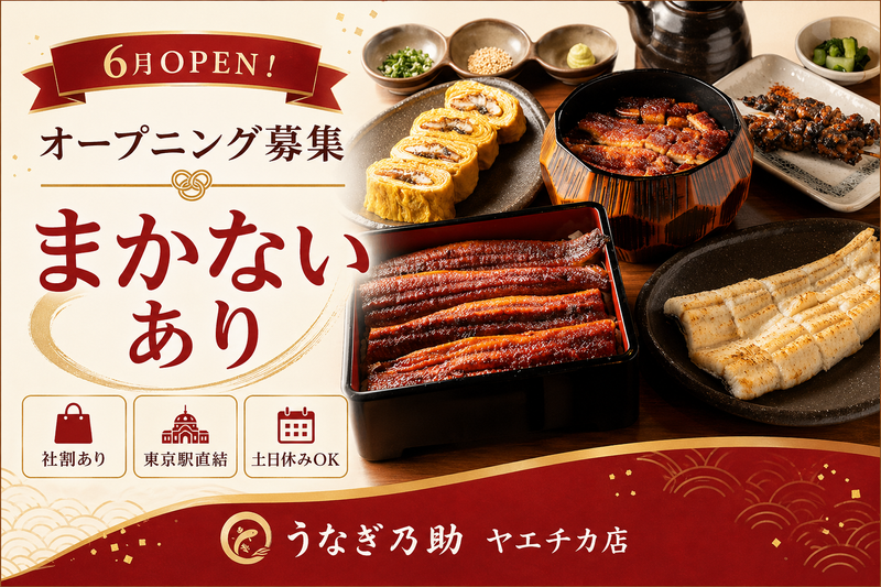 仕事内容 ======================== ✨東京駅直結/6月10日OPEN/未経験歓迎✨ ●正社員オープニングスタッフ大募集● ======================== ⧉……………………………………………⧉ ✅月給25万円スタート ✅固定残業なし✨ ✅完全週休2日制 ✅未経験歓迎✨ ✅マニュアル完備 ✅オープン前の既存店研修も可能 ⧉……………………………………………⧉ / 飲食業界が初めての方も安心。 無理なく正社員デビューしませんか? \ 「飲食店で働いてみたいけど、未経験で不安」 「正社員として安定して働きたい」 「残業前提ではなく、休みもしっかり取りたい」 「新しいお店で、人間関係もゼロから始めたい」 そんな方にぴったりの求人です。 うなぎ料理を中心とした和食居酒屋『うなぎ乃助』で、 ホール・キッチンを含む店舗運営業務をお任せします。 未経験の方も、マニュアル・研修体制があるため安心です。 オープニング募集のため、新しい仲間と一緒にスタートできます。 オープン前の既存店研修も可能! ✨希望に合わせた勤務開始/6月からの勤務開始もOK✨ ※研修時の交通費支給 【業務内容】 接客・レジなどのホール業務から、 マニュアルに沿った調理・仕込みなどのキッチン業務まで、 少しずつ覚えていただきます。 ▼ 具体的なお仕事 ▼ ・お客様のご案内、オーダー取り ・料理、ドリンクの提供 ・レジ会計 ・テーブルの片付け ・マニュアルに沿った調理、盛り付け、仕込み ・洗い場、店内清掃、衛生管理 ・慣れてきたら店舗運営業務にもチャレンジ ◤ ̄ ̄ ̄ ̄ ̄ ̄ ̄ ̄ ̄ ̄ ̄ ̄ ̄ ̄ ̄ ̄ ✨『乃助』で働く魅力✨ ________________◢ ✅固定残業なし!働いた分はきちんと支給✨ ✅完全週休2日制で、休みもしっかり確保✨ ✅未経験から正社員としてスタートできる♪ ✅マニュアル・研修体制ありで、飲食未経験でも安心✨ ✅6月10日オープン!新しい仲間と一緒にスタート✨ ✅東京駅直結で通勤ラクラク&雨の日も安心! ◤ ̄ ̄ ̄ ̄ ̄ ̄ ̄ ̄ ̄ ̄ ̄ ̄ ̄ ̄ ̄ ̄ ✨未経験でも安心の理由✨ ________________◢ うなぎ料理を扱うお店ですが、職人技は必要ありません。 調理工程は焼き工程も含めて標準化されており、 マニュアルに沿って進められる環境です。 オープン前に既存店で研修を受けられるため、 接客や調理の流れを事前に覚えてから新店舗で働けます。 「飲食店は初めて」 「包丁を使う仕事に自信がない」 「うなぎ屋さんは難しそう」 そんな方も安心してスタートできます。 ◤ ̄ ̄ ̄ ̄ ̄ ̄ ̄ ̄ ̄ ̄ ̄ ̄ ̄ ̄ ̄ ̄ ✨無理なく働ける正社員✨ ________________◢ 月給25万円スタート。 固定残業はありません。 残業が発生した場合は、法定通り別途支給します。 完全週休2日制のため、休みもしっかり確保できます。 「正社員として安定して働きたい」 「飲食業界でも、休みを大切にしたい」 「無理な働き方ではなく、長く続けられる職場を選びたい」 そんな方にも働きやすい環境です。 ◤ ̄ ̄ ̄ ̄ ̄ ̄ ̄ ̄ ̄ ̄ ̄ ̄ ̄ ̄ ̄ ̄ ✨働いた分はしっかり反映✨ ________________◢ *法定割増はきちんと支給* ・時間外労働:+25% ・月60時間超の時間外労働:+50% ・法定休日労働:+35% ・深夜労働:+25% 「サービス残業がある飲食店は避けたい」 そんな方にも安心の環境です。 ――――――――――― キャリアアップについて ――――――――――― まずは研修で基礎を学び、 オープン後は接客・調理・店舗の流れを少しずつ覚えていきます。 慣れてきたら、スタッフ育成やシフト管理など、 店舗運営にもチャレンジできます。 未経験からでも、将来的にはリーダー・店長候補など、 キャリアアップを目指せる環境です✨ ――――――――― うなぎ乃助について ――――――――― 全国に10店舗以上を展開する、成長中のうなぎ専門店チェーンです。 高級なイメージのあるうなぎを、もっと気軽に楽しめるお店として成長中。 安定した運営基盤の中で、未経験から飲食業界にチャレンジできます。 新店舗を一緒に盛り上げていきましょう✨ ――――― アクセス ――――― ■東京駅 八重洲口 徒歩5分 ■日本橋駅 徒歩5分 東京駅直結で、雨の日も通勤しやすい立地です。