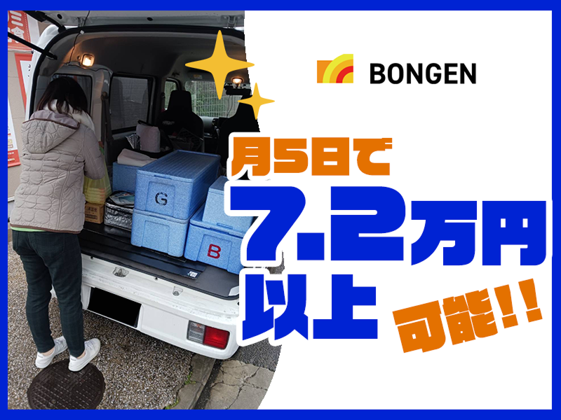 仕事内容: 軽貨物配送ドライバー募集 ========================== お弁当配送、個人宅配送サービス * 売上が安定したお仕事が可能 * 1人作業ではないので安心 * 案件によって同乗研修もあり ========================== ①免許証1枚でスタート出来る 車をお持ちでない方も即日稼働スタートできます、車両は他案件やプライベートの使用OKです。 ②副業などでお仕事をしたい方にオススメ 「1日フルに働けない」「週に2.3日しか働けない」という方も安心して下さい。部分だけの働きでもOKです。 ③これからは配送のお仕事を中心に働いてみたいとお考えの方向け 期間限定募集ではありますが、終了後も案件紹介可能! ④とにかく沢山稼ぎたいとお考えの方 違う稼ぎ方もあります ※上記日当を超える為には宅配の推奨します ========================== ✅ご応募(TEL)はこちらまで 株式会社BONGEN 面接担当 小林 03-4500-1456 080-5689-3040(直通) ==========================