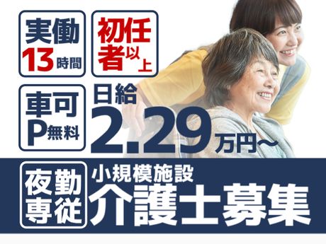 仕事内容 ■住宅型有料老人ホームにおける夜勤専従介護業務全般 ※夜勤2名体制 <主な業務> ・食事の配膳、下膳等の食事介助 ・トイレ誘導、オムツ交換等の排泄介助 ・ナイトケア、モーニングケア ・夜間時の安否確認、コール対応 ・介護記録の作成(タブレット使用) など <お仕事の1日のスケジュール例> 16:15~ 出勤、申し送り、業務分担表確認 18:00~ 夕食:食事配膳、下膳などの食事介助 19:00~ 就寝介助:更衣、トイレ誘導、排泄介助 21:00~ 夜間帯の見回り、コールの対応(1人は1時まで仮眠) 00:00~ 食事量・水分量などの確認、物品補充、介護記録作成、休憩 01:00~ 巡回、ナースコール対応(1人は5時まで仮眠) 05:00~ 早朝の見回り(排泄介助)、コールの対応 07:00~ 起床介助:更衣、トイレ誘導、排泄介助 07:30~ 朝食:食事配膳、下膳などの食事介助 ~09:15 介護記録の記入、申し送り、退勤 <派遣先> 定員59名 サービス付き高齢者向け住宅 <通勤方法・その他補> ※車通勤可能(無料駐車場あり) ※ガソリン代支給あり(片道2km以上で10円/km) <新型コロナウイルス感染防止対策実施> マスク着用での勤務、アルコール消毒液完備などの感染対策をし、利用者様もスタッフも守れるよう体制を整えています。 <受動喫煙対策> あり(屋内禁煙) ■受動喫煙対策についての特記事項 屋外に指定喫煙所あり ここがポイント ■日給2万2900~2万4200円(介護の資格をお持ちの方) ■16:15~翌9:15(実働13時間)勤務 ■週2回勤務よりご相談ください ■夜勤2名体制 ■定員59名サービス付き高齢者向け住宅 ■車通勤OKなので通勤ラクラク♪(無料駐車場あり) ■ガソリン代支給あり ■交通費全額支給