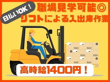仕事内容 リフトによるオフィス用品や飲料などの入出庫作業をお願いします <こんな方の応募が多数です> (1)「次のお仕事が決まるまでのつなぎに◎ 即日勤務OK!すぐに働けます」 (2) 「ブランク期間をつくらず収入確保!転職活動と両立できるお仕事」 (3) 「スグ働ける!日払い・週払いOK◎ 転職準備中の収入も安心」 「転職活動中も収入をキープ!スキマ時間で働ける柔軟シフト◎」 「正社員へのステップにも◎ 経験不問&即日スタートで新しい一歩を!」 他にも主婦(夫)・パートさんも活躍しています 【いつでもどこでも登録OK★】 ◆登録時【履歴書不要】【来社不要】 ◆当社HPから、365日/24hいつでもWEB登録可能♪ <Q&A>入社までの流れについて Q. 応募してからどれくらいで働けますか? A. 応募から入社までは、1週間~通常2週間以内の現場が多くなっています。 Q. 急いで仕事を始めたいのですが対応してもらえますか? A. 即日面談やスピード対応が可能な案件もご案内可能! ご希望をお伺いして、最短で就業できるお仕事をご紹介いたします。 Q. 他の仕事と比較してから決めたいのですが、相談だけでも可能ですか? A. もちろん可能です。 複数の選択肢をご提示しながらご案内します! <Q&A>収入について 【お給料の支払いについて】 Q. 日払いは対応していますか? A. はい、日払いに対応しています。 前日の11時までに申請⇒当日の夕方までにお給料をお受け取りいただけます。 Q. 夜勤の場合でも日払いは可能ですか? A. はい、夜勤後も対応可能です。 お仕事終了後、朝11時までに申請⇒その日のうちにお給料をお受け取りいただけます。 Q. 前払い制度はありますか? A. ご利用可能です。 詳細は勤務先や就業形態によって異なりますので、ご相談時にご希望をお伝えください。 Q. 申請方法は難しいですか? A.どなたでもスムーズにご利用いただけます。 スマートフォンやPCからの申請も可能です!