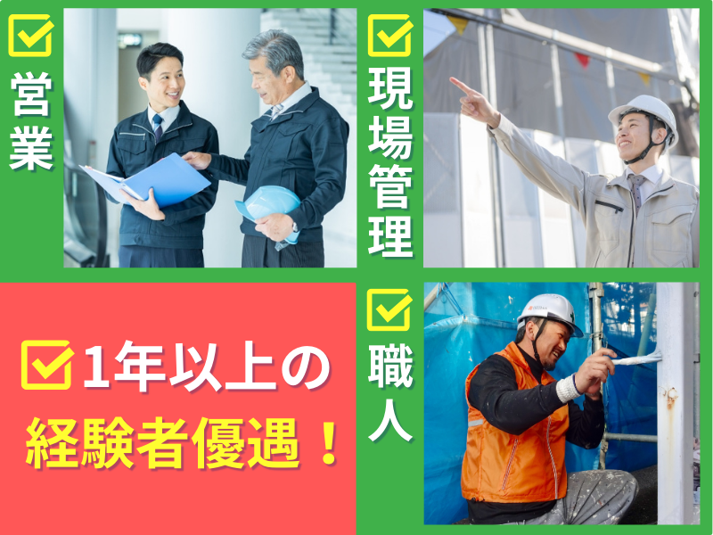 【保険制度】 雇用保険、労災保険、健康保険、厚生年金 待遇・福利厚生 【福利厚生】 ■交通費別途支給(マイカー通勤OK):通勤距離に応じて支給 ■家族手当支給(社内規定による) ■各種資格取得支援制度あり(外装劣化診断士・雨漏り診断士等) ■賞与あり(年2回) ■インセンティブあり(社内規定による) ■人事評価制度適用(役職手当付与) ■県外への転勤なし※ショールーム間での移動がある場合は要相談