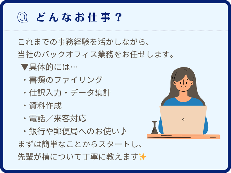 仕事内容 ╭━━━━━━━━━━━━━━╮ 事務経験を、次のステージへ。 “食べる”を支える安定企業で 一生モノのスキルを手に入れる! ✨ ╰━━━━v━━━━━━━━━╯ 「一般事務の経験はあるけれど、もっと専門性を身につけたい」 「安定した会社で、将来を見据えて長く働きたい」 「土日休み・残業少なめで、プライベートも大切にしたい」 そんな20代・第二新卒の方にピッタリの環境です! ✅ 月給22.3万円〜23.3万円 ✅ 昇給あり/賞与年2回支給 ✅ 8:00~17:00(残業少なめ・月平均15h) ✅ 年間休日120日!土日祝休みが基本 ✅ コンビニやスーパーの容器を作る安定メーカー ✅ 20代の先輩も活躍中!質問しやすい環境 ✅ うれしいランチ補助あり♪ ■ お任せするお仕事 ┈┈┈┈┈┈┈┈┈┈┈┈┈•• これまでの事務経験を活かしながら、 少しずつ「総務・経理」の知識を深めていきましょう! ▼具体的には…  ̄ ̄ ̄ ̄ ̄ ̄ ̄ ̄ ・書類のファイリング ・仕訳入力(専用ソフト) ・データ集計(Excelなど) ・資料作成:会議資料の準備など ・電話・来客対応:明るい挨拶をお願いします♪ ・外出業務:銀行や郵便局へのお使い 「総務って難しそう…」と思うかもしれませんが、大丈夫。 まずは簡単なことからスタートし、 先輩が横について丁寧に教えます✨ ■ 1日のスケジュール例 ┈┈┈┈┈┈┈┈┈┈┈•• 8:00 出勤・業務開始 ・メール確認 ・先輩との打ち合わせをして、 1日のタスクをチェック! 8:30 仕訳入力 ・預金入出金データ等の入力 10:30 郵便物振り分け 11:00 外出業務 12:00 お昼休憩(1時間) ランチ補助を利用して、おトクにお昼ごはん♪ 13:00 書類のファイリングや整理 15:00 資料作成 17:00 その他電話・来客対応・退勤 「お疲れさまでした!」 残業は少なめなので、平日の夜も充実 ■ 職場の雰囲気 ┈┈┈┈┈┈┈┈•• 現在、20代〜40代のメンバーが中心となって活躍中! 「親切な対応」をモットーにしている部署なので、 困ったことがあっても「どうしました?」と すぐに声をかけてくれる優しい先輩ばかりです。 「落ち着いた職場で、一歩ずつ成長していきたい」 そんな方にぴったりの温かい雰囲気ですよ✨ ■ 代表・採用担当より ┈┈┈┈┈┈┈┈┈┈┈•• 当社は1965年の創業以来、 皆さんがコンビニやスーパーで目にする 「あの食品容器」を作り続けてきました。 景気に左右されにくい「食」のインフラ。 だからこそ、腰を据えて長く働いていただけます。 「安定した環境で、事務としてスキルアップしたい」 そんなあなたの挑戦を、全力でバックアップします!