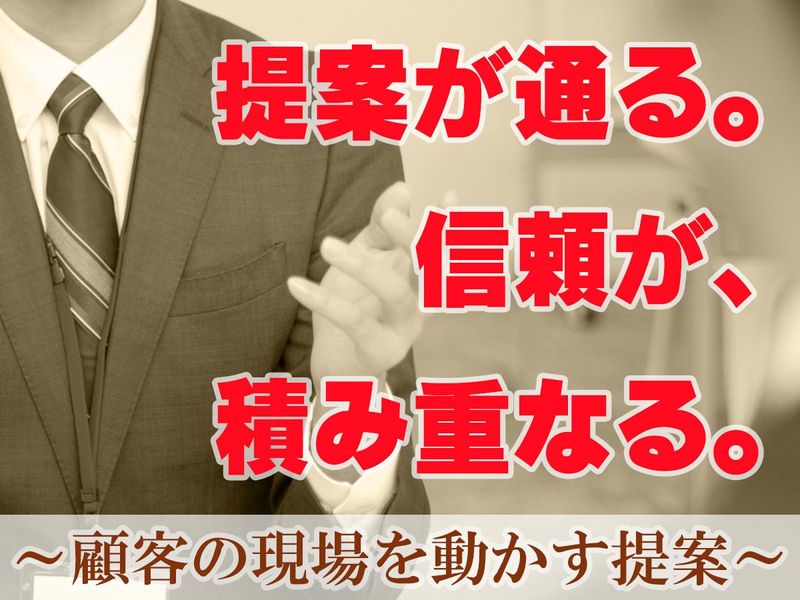 仕事内容 顧客との関係性を大切にする 営業スタイルの方を大歓迎! お客様から「選ばれる喜び」を 幾度となく味わえる当社で 今までの営業経験を活かして下さい。 商材は建築・土木業界での経験が ある方ならおなじみの「型枠」。 液状のコンクリートを建物の基礎や 壁の形に固定するために必要となる 仮設物です。その型枠販売が当社の事業。 工務店様、建築会社様への 提案営業を、あなたにお任せします。 ■顧客ごとに最適な提案を■ いつまでに必要? どれぐらい必要? 品質重視?使いやすさ重視?など、 お客様によってご要望は異なります。 それを引き出すのが、 当社での営業としての第一歩。 ご要望に応えられる提案ができるように なれば、一人前の営業です! ■まずは関係性の構築から■ 最初の1~2週間程度で商品知識を 身につけたら、次は先輩社員に同行。 3ヶ月~6ヶ月程度、学んでいただき、 徐々に顧客の担当をお任せします。 先輩が築いてきた信頼関係を、 より深めていって下さい。 ■パートナーとなれる喜び■ 状況確認程度の会話のみのお客様でも お会いする回数を重ねるうちに 「この日までに型枠、用意できる?」と 相談していただけるようになります。 「急なお願いだったのに、助かったよ」 「次もぜひ、お願いしますね」 そんな嬉しいお言葉もどんどん増え、 「この案件なら、どの型枠がいい?」と 相談相手として認められるように! 単なる業者ではなく、 ビジネスパートナーとして選んで いただけることは、最高の喜びです。