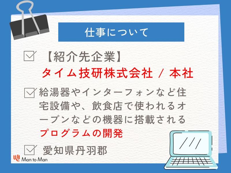 仕事内容: 【職種】 (正社員)ソフトウェアの開発業務 【仕事内容】 正社員での求人でました! \ワンチップマイコンのソフト開発業務/ C言語を使用し、 ソフト仕様を含めた開発業務を行います。 具体的には、 お客様との打ち合わせ → 仕様検討 → ソフトウェア設計 【勤務先】 タイム技研株式会社 / 本社 【勤務帯】 日勤のみ(9時~18時) 休憩 12時~13時、15時45分~16時 【休日】 完全週休二日制(土日休み) 年間休日 120日程 【給与】 月給350,000~ 【手当】 資格手当、役職手当 通勤手当(全額支給) 家族手当 【その他】 ・作業着支給あり(無償) ・社宅あり(15,000円/月) 20代、30代、40代、50代の 男女ともに活躍中! ご応募お待ちしております。