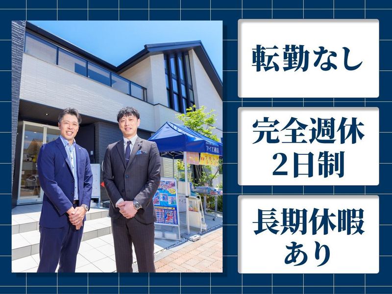 仕事内容 業界経験者が実感! 「アイ工務店に転職して良かった!」 その理由は・・・ *『高品質×適質価格』で売りやすい! └ 1人当たりの年間契約棟数の平均は7棟 *『明確な評価制度』で稼ぎやすい! └ 契約1件ごとにインセンティブを支給 *『完全週休2日制』で休みもしっかりとれる! └ 年末年始は16日前後の長期休暇もあり 【仕事内容】  ̄ ̄ ̄ ̄ ̄ ̄ ̄ ̄ ̄ ̄ ̄ ̄ ̄ ̄ ̄ ̄ ̄ ̄ 木造注文住宅の企画・提案をお任せします。 わたしたちの仕事のスタイルは… ✅ 100%反響営業 TVCMやSNS、インフルエンサーなどを 積極的に活用して集客を効率化。 モデルルームに来場されたお客様や SNSやHPを見てお問い合わせいただいた お客様へのご案内・ご提案となります。 ✅ 一気通貫型 当社では営業・設計・積算を一人で担当する 「一気通貫型」の営業スタイルを 採用しています。 お客様への対応がスピーディになり、 契約に繋がりやすく、分業制では得られない 幅広いスキルも身につきます。 【中途入社者が実感する魅力】  ̄ ̄ ̄ ̄ ̄ ̄ ̄ ̄ ̄ ̄ ̄ ̄ ̄ ̄ ̄ ̄ ̄ ̄ 中途入社者の約7割が住宅業界経験者です。 経験者だからこそ実感する アイ工務店の魅力をご紹介します。 |◤明確な評価制度◢| 明確なルールに基づき、経歴や勤続年数に 関わらず、自身の頑張りがダイレクトに 給与に反映されます。 ◆売上棟数・金額で給与・役職を決定 ◆契約1件ごとにインセンティブを支給 半年間の引渡金額が一定を超えると インセンティブが【倍増】します。 ◆入社1~3年で営業所長へ昇進した実績多数 |◤高品質×適質価格の商品力◢| 「この品質でこの価格なら、売れて当然!」 と業界他社からの入社者も納得の 商品力があります。 ◆商品に自信あり! だからこそ1人あたり年間契約棟数が 業界平均3~4棟といわれているなか、 当社の平均は7棟、50%以上の営業が 年間7棟以上の契約をいただいております。 ※入社1年目の社員も含む |◤業界トップクラスの成長率◢| 2010年の設立以来、15期連続の増収増益を達成。 今なお成長を続ける、勢いのある会社です。 ◆2025年6月にて売上2,010億円達成 ◆高い収益性(利益率10%超) ◆健全な財務体質(自己資本比率50%超) ◆全国300以上の拠点を展開。 ◆2026年6月末までに330拠点体制を 目指しています。 ◆事業拡大に伴い、管理職ポストも豊富にご用意! 実力次第で入社後数年での昇格も可能です。 |◤ワークライフバランスの実現◢| メリハリをつけた働き方ができるよう 休暇制度を整備。 また残業を減らすための取り組みも 推進しています◎ ◆完全週休2日制(火水or水木) ◆長期休暇あり (年末年始16日間の実績) ◆生産性向上の取り組み └不要な会議の削減 └営業管理の自動化を推進 ◆転勤なし(希望勤務地で活躍可能) 【中途入社者の声】  ̄ ̄ ̄ ̄ ̄ ̄ ̄ ̄ ̄ ̄ ̄ ̄ ̄ ̄ ̄ ̄ ̄ ̄ ✅前職:大手住宅メーカー営業(40代) 前職では、成果を出す・出さないに 関わらず、毎年昇給していくという 年功序列な制度でした。 当社には『係長』として入社。 『年間8棟』という明確な昇格基準を 2年連続でクリアし、『部長』に昇進。 年齢や社歴ではなく、成果を正当に 評価してくれる環境に満足しています。 ✅前職:ハウスメーカー営業(30代) 前の会社では契約を取ってもすぐに給料が 上がる事はなく、毎年少しずつ上がっていく 給与形態でした。 アイ工務店では自分が頑張った分だけ 給料に反映され、頑張れば20代、30代でも 稼ぐことができます。 実際に自身も、入社してから給料が増え、 生活水準が上がったと実感しています。 また社員旅行が年に1度あり、 初めての海外旅行も経験できました。 給与形態はもちろん、それ以外でも 仕事をまた頑張ろうと思えるような 環境があると感じています。