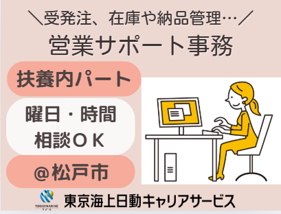 仕事の内容 \働き方相談できる扶養内パート/ ◆週3~4日&実働4~6時間で相談OK ◆頑張り次第で直接雇用の可能性あり @北小金駅チカ 【基本情報】 雇用形態:派遣社員 雇用期間:長期(3カ月以上) └1月~開始日相談可能 就業時間:9:00~14:30(休憩60分) └9時~17時の間で、実働4~6時間の相談OK 【必須条件】 ◆営業事務のご経験ある方 ◆パソコン:基本操作(入力~修正) 【お仕事内容】 ・受発注業務 ・販売管理システムへの入力 ・電話、メール対応 ・在庫、納品管理 など 【環境面等】 自動車部品の商社 └@北小金駅チカ/周辺にはスーパー、コンビニあり ・40代・60代の多い職場 └男女比1:1 └わからないことは質問、確認をしながらオシゴトできる環境です ・お弁当持参OKです ・オフィスカジュアル内で服装自由 【福利厚生等】 ・扶養内OK ・禁煙オフィス!煙苦手な方も安心 ・平日のみOK!選べる週3~4日 ・土日休み └基本、祝日出勤ですが難しい場合は相談できます! ・年間休日120日以上&お休み相談可 └有給休暇 ○●ご応募検討中の方へ●○ ご経験をいかして、ムリなくご勤務いただける時短パートです。 ご家庭のご都合に合わせてご相談ください 少しでも気になった方は、ぜひお気軽にご応募ください♪ ○●嬉しいPOINTたくさん!●○ 履歴書不要!開始日相談OK/長期×扶養内パート*週3~4日&実働4~6時間で相談OK/通勤時間を節約!地元で働ける@北小金駅チカ/ブランクOK!/残業ほぼなし!定時退社OK