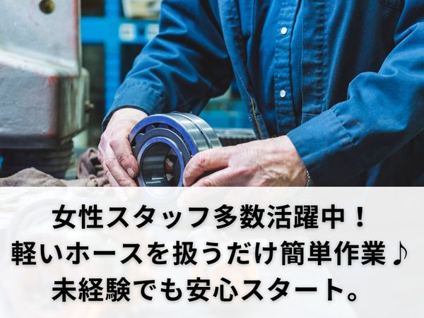 仕事内容 【 業務内容 】 工業用ホース(軽量タイプ)に部品の取り付け・結束・出荷準備を行っていただきます。 扱うホースは細く軽いので、体への負担はほとんどありません。 冷暖房完備の快適な作業環境で、立ち作業と座り作業を交互に行いながら、モクモクと集中して作業できます。 未経験から始めた女性スタッフも多数活躍中です。 【 おすすめポイント 3つ 】 ✨ 未経験OK!丁寧な研修で安心スタート ✨ 幅広い世代のスタッフが活躍中 ✨ 冷暖房完備の快適職場での軽作業 【 1日の流れ 】 8:30 出勤 8:30〜10:10 作業 10:10〜10:20 休憩 10:20〜12:00 作業 12:00〜13:00 昼休憩 13:00〜15:00 作業 15:00〜15:15 休憩 15:15〜17:00 作業 【 職場環境について 】 ■ 主夫・主婦活躍中 ■ 女性スタッフ多数在籍 ■ 髪型・髪色自由 ■ ネイル・ピアスOK ■ 服装自由/髭OK ■ 冷暖房完備 ■ 男女別化粧室 ■ 休憩スペース・お昼を食べる場所あり ■ 冷蔵庫・電子レンジ使用OK ■ お弁当持参OK ■ 制服貸与/個人ロッカー・机あり ■ 転勤なし