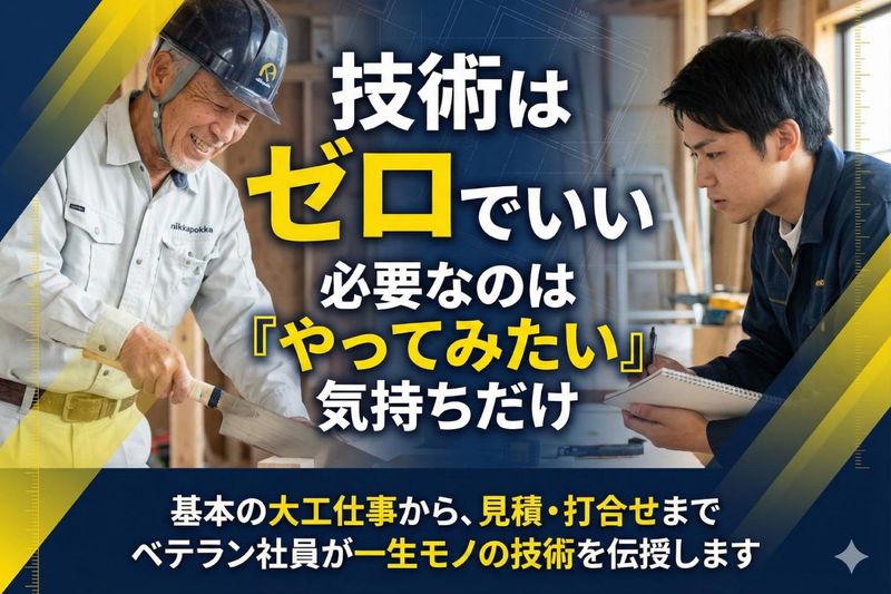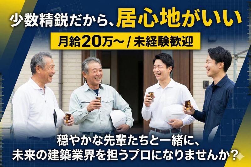 仕事内容 / ゼロから大工の技術を習得可能◎ 将来的には、見積もりや現場管理への ステップアップも応援! \ 少人数ならではの温かみのある雰囲気で 穏やかな職場だから馴染みやすい♪ <賞与あり><退職金共済加入>で 将来の安心もバッチリです。 ・‥━━━★・‥━━━★・‥━━━★ 当社は、一般住宅のリフォーム工事など 建築工事を手掛けている会社です。 現在は40代〜50代の ベテラン社員が中心に活躍中! イチからじっくりと教え、 次世代を担う人材を育て上げたい ―― この仕事の楽しさとやりがいを、 未経験の人にも知ってもらいたい ―― そんな代表の想いから、 今回の募集が決定しました! 社員はみんな穏やかで、 職場はいつも和やかな雰囲気です。 【 業 務 内 容 】 一般住宅のリフォーム工事における、 職人業務および それに付随する業務をお任せします。 ◆大工工事(木工作業など) ◆資材の運搬 ◆現場の清掃、片付け ◆その他、工事に付随する雑務など 経験や資格は問いません。 まずは明るい対応、 明るい挨拶ができれば十分です! 現場のサポートからスタートし、 徐々に道具の使い方や技術を 学んでいきましょう。 先輩がイチから丁寧に指導します。 ~ ある1日のスケジュール例 ~ ▼8:00 出勤・現場作業スタート 資材の運搬や現場の片付けなど、 先輩をサポートしながら 流れを覚えます。 (午前に1回、15分休憩) ▼12:00 休憩時間(1h) しっかり休んで午後に備えます。 ▼13:00 作業再開 午前中の続きや付帯工事を行います。 (午後にも1回、15分休憩) 17:30 退社 お疲れ様でした! ・‥━━━★・‥━━━★・‥━━━★ ⭐「一生モノの技術+α」が身につきます ・・・・・・・・・・・・・・・・・・・・・・・・・・・・・・・・・・・・・・・ 現場での作業に慣れてきたら、 適性や希望に応じて 現場の下見や管理、お客様との打ち合わせ、 見積作成、さらには契約まで、 幅広い業務を経験することが可能です。 技術者(職人)としての腕だけでなく、 現場全体をコントロールする 『管理能力』も身につきます。 「ずっと現場で技術を磨きたい」 という方はもちろん、 「将来を見据えて、 多角的なスキルを身につけたい」 という意欲のある方を、 会社をあげて全力でバックアップ◎ 新しいことに、ワクワクしながら 挑戦していきましょう!