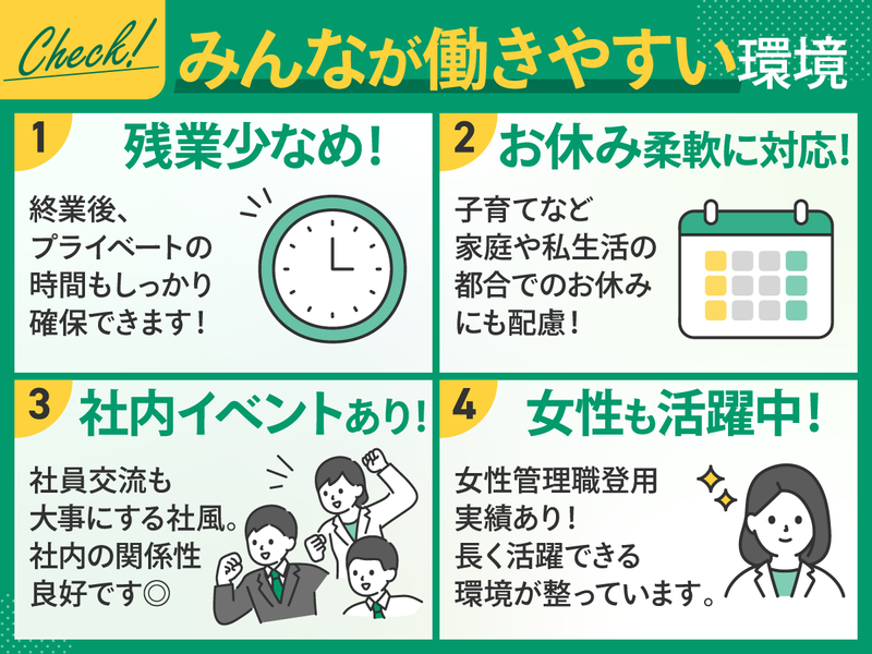 休日休暇 週休2日制(水曜定休+他1日) *年間休日115日 *有給あり/初年度10日の有給休暇あり *GW・お盆・年末年始の長期休暇あり *産前・産後休暇、育児休暇あり (取得実績・復帰実績多数あり) 【お休み調整可能】 事前のご相談で土日休みや水曜日に 続けて連休を取ることも可能です。 【女性が活躍中!女性管理職登用実績あり】 *プライベート都合でシフト調整も柔軟対応 *産休・育休取得実績多数あり *育休復帰の子育てママ在籍中 *学校行事などで積極的にお休み取得OK キャリア形成に影響することもありません。