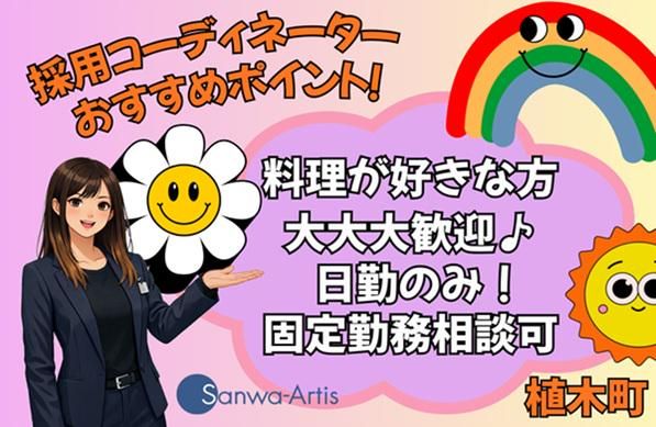 仕事内容 あなたのライフスタイルにあわせた お仕事みつけませんか 【求人コーディネーターよりごあいさつ】 サンワの求人をご覧いただき、ありがとうございます。 私たちは『共に学び、共に生長する』という企業理念のもと、すべての方により添うことを大切にしています。 本日は最後までみていただけるとうれしいです。 【採用コーディネーターより】 ╭━━━━━━━━━━━━━╮ ✨ここが魅力!✨ ╰━━━━━━━━━━━━━╯ ⭐時給1250円!月収21万円以上も可能 ⭐残業なし!プライベート充実! ⭐固定勤務の相談OK!生活に合わせやすい ⭐冷暖房完備の清潔な厨房で快適! ⏩仕事内容  ̄ ̄ ̄ ̄ ̄ ̄ ̄ ̄ ̄ ̄ ̄ ̄ ̄ ̄ ̄ 施設内での栄養管理・調理業務です。 栄養士の知識を活かして、利用者さまの 健康を支える大切なお仕事です! ■お仕事内容■ ✅献立の作成・栄養計算 └利用者さまに合わせたメニュー作成 ✅調理・盛り付けの指示 └調理スタッフと協力して進めます ✅衛生管理のチェック └厨房内が清潔に保たれているか確認 ✅一部、調理のサポート └忙しい時間帯のお手伝いなど ⏩ 経験を活かして活躍できる!  ̄ ̄ ̄ ̄ ̄ ̄ ̄ ̄ ̄ ̄ ̄ ̄ ̄ ̄ ̄ ✅ 管理栄養士の実務経験がある方限定 ✅ あなたのスキルを正当に評価します ✅ ブランクがある方の復職も応援! 「これまでの経験を活かして働きたい」 「資格に誇りを持って仕事がしたい」 そんな方を、現場は心待ちにしています! ⏩働きやすい環境  ̄ ̄ ̄ ̄ ̄ ̄ ̄ ̄ ̄ ̄ ̄ ̄ ̄ ̄ ̄ ✅残業なしでプライベート充実! ✅社会保険は即日加入が可能 ✅20~50代など幅広い年代が活躍中! ✅利用者さんに感謝されるお仕事 「おいしかったよ」の言葉が モチベーションに繋がります。