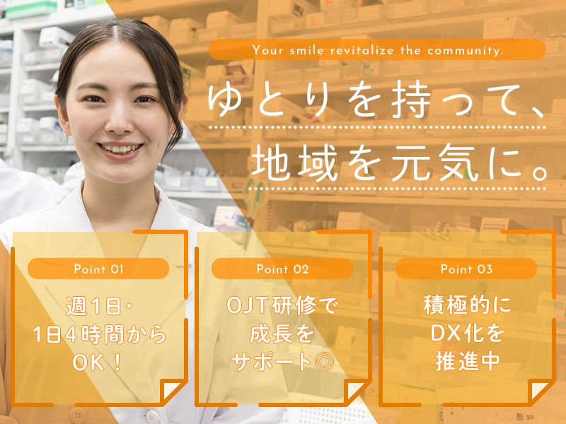 仕事内容 〇●‥‥‥‥‥‥‥‥‥‥‥‥ \週1日・1日4時間〜勤務OK/ ✅ママ&パパさんスタッフ活躍中 ✅ホッと落ち着ける小規模薬局✿ 自分にぴったりのペースで 患者さまに笑顔を届けませんか? ‥‥‥‥‥‥‥‥‥‥‥‥●〇 《 求人の魅力は? 》 *自由度の高いシフトが魅力! *日々の頑張りは昇給でカタチに *20代~50代までの幅広い世代が在籍 *安心のOJT研修でしっかりサポート♪ *資格取得支援&研修費の補助あり *薬剤師認定資格も取得できます 【 業務内容をチェック 】 ・薬局における調剤全般 ・在宅訪問 ・薬歴記入 ・医薬品管理 ・OTC販売 ・患者さまからの相談 ⇒電話相談を含む ✨積極的にDX化を推進中✨ スタッフの負担を軽減できるよう 環境整備に力を入れています〇