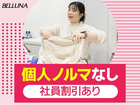 仕事内容 ベルーナのアパレル店舗スタッフ 販売スキル不要!個人ノルマ無し! ▼仕事内容 ★販売・接客 ★商品陳列・整理 ★品出し・補充 ★清掃 ★レジ応対 など ※お客様に試着やお探しの商品のご案内もあります。 先輩スタッフのフォローがあるので安心◎ お店で活躍している方の約8割が未経験からのスタート! 自分で考えたコーディネイトをSNSで発信する事もできちゃう☆ ★★嬉しい社割でオシャレを楽しめる★★ お得な社員割引(30%オフ)が使えるから、 流行りやシーズンに合わせてオシャレを楽しみながら働くことが可能◎ [例]トップス 定価 2,490円 → 社割 1,743円 <上下コーディネートしても3500円程度♪> ★時間・曜日のシフト応相談★ 「子供が急に熱を出した」 「学校行事でお休みしたい」など みんなで協力し合える環境! ★面接時のPOINT★ 【面接1回】で完結♪♪ 入社日は相談の上、決定します。ご希望をお聞かせください◎ <面接での質問内容をご紹介>※店舗により多少異なります ・カンタンな自己紹介 ・なぜBELLUNAにご応募いただいたか ・今までどんなお仕事を経験してきたか(もちろんアルバイトデビューもOK♪) ・ご希望のシフトや出勤日数・曜日など ・いつから働きたいか ◎面接といっても、堅苦しくない面談のようなスタイルで実施しますので、緊張せずにご参加ください! ◎履歴書不要!面接にお越しいただいた際に、アンケートシート(5~10分)の記入をお願いしています♪ ※アンケートシート(5~10分)+面接20~30分程度を予定しています!