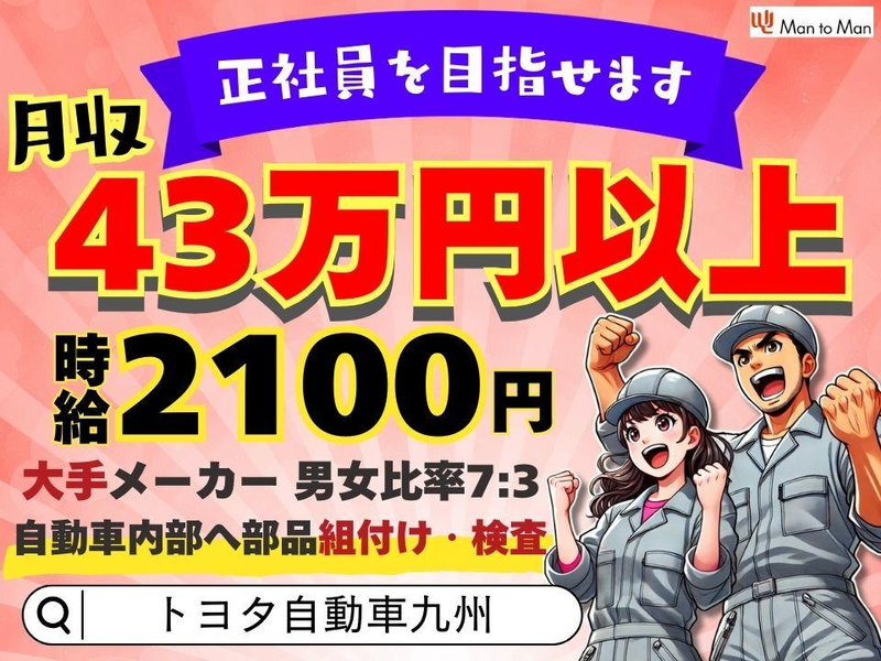 ■仕事内容 \選べる2つの待遇~どちらでも“安定収入”が叶う!/ (1)時給2,100円(月給43万円以上)+入社祝金100万円 (2)時給1,800円+入社特典190万円(入社祝い金100万円、寮費補助90万円相当) 月収43万円以上 or 入社特典190万円 ─スタート時点で経済的な安心感が得られるのが魅力! 「今すぐ収入がほしい」「ゼロからやり直したい」 そんな前向きな気持ちを、しっかり後押しします! 【仕事内容】 <トヨタ自動車九州 宮田工場内> 自動車製造にかかわるお仕事です。 組立工程で「部品の取り付けに不具合がないか」や 「傷や汚れがないか」のチェック業務をお任せします。 多数のパーツが“1台のクルマ”として完成する姿を見届ける やりがいのある工程に携わります。 ※配属は適性に合わせて決定します。 募集職種と異なる配属となる可能性があります (組立・品質管理・ほか各工程の可能性あり) \未経験でも大丈夫!研修サポート充実/ まずは3日間の基礎研修。 その後は1.5~2ヶ月間、メンターが横についてフォローします。 工程は細かく区切られているため、 ひとつずつ覚えていけばOK。 「学校卒業後はフリーター経験しかない…」 そんな方でも問題ありません。 段階的にスキルが身につき、 国産車づくりという大きなプロジェクトの 一員として活躍できます。 \憧れのTOYOTAの車づくりに関われる!/ 未経験から始めて正社員登用も目指せる 「製造は未経験。でもキャリアは積みたい」 「30代前までに正社員を取りたい」 そんな“今の自分を変えたい人”を、 コーディネーターが徹底サポート。 面接練習や試験対策も一緒に行いながら、 正社員登用を目指しましょう。 TOYOTAに関われる誇り+将来の安定が どちらも手に入るチャンスです。 もちろん、短期も大歓迎です! ■仕事の特徴 車通勤OK 髪型・髪色自由 友達と応募OK フルタイム歓迎 長期歓迎 副業・WワークOK シフト制 フリーター歓迎 学歴不問 未経験・初心者OK ブランクOK 経験者・有資格者歓迎 資格不問