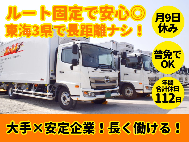 仕事内容 4tトラックでスーパー向けに 食品のルート配送をお願いします。 具体的には… ・台車での積込み作業 ・スーパーへの配送 ・積み下ろしやご挨拶など ◎ゲート付きトラックで、配送は 台車で行うので負担は少なめ! □配送商品: 大手スーパー向けの低温・チルド食品 □配送エリア:東海3県/長距離なし ※納品時間もルートも固定です◎ □配送件数:1日2便 ※1便ごとの配送先は1箇所のみ ◆早朝スタートで16時頃には退社可  ̄ ̄ ̄ ̄ ̄ ̄ ̄ ̄ ̄ ̄ ̄ ̄ ̄ ̄ ̄ ̄ 5:00~14:00の勤務のため、 残業があっても夕方には退社できます。 生活リズムが整えば、夕方自由な時間が 増えて、プライベートも充実◎ ◆台車使用のため体の負担は少なめ  ̄ ̄ ̄ ̄ ̄ ̄ ̄ ̄ ̄ ̄ ̄ ̄ ̄ ̄ ̄ ̄ ゲート付きトラックのため、 積み下ろしはラクラク。 店舗への入庫も台車を行うため、 身体的な負担は少なめです。 ◆月9日休みで希望休も相談OK◎  ̄ ̄ ̄ ̄ ̄ ̄ ̄ ̄ ̄ ̄ ̄ ̄ ̄ ̄ ̄ 希望休も取得が可能です。 自分ではなかなか申請しにくい... という方でも5日間の有給計画付与が あるため、しっかりお休みが取れます。 ◆独り立ちまでの流れ  ̄ ̄ ̄ ̄ ̄ ̄ ̄ ̄ ̄ ̄ まずは教育係が横乗り(1~3ヶ月) └先輩の車への同乗もあり └比較的回りやすいコースからスタート ▼ 慣れたら独り立ち └独り立ち後も1ヶ月程度は 管理者やセンター長が 横乗りでしっかりサポート◎ - 【名阪急配について】 大手コンビニやスーパーへの食品物流を中心に、 電子部品、自動車部品、医薬品などを扱う 物流センターの運営・管理から仕分け・配送、 アフターフォローまで行うBtoBの物流会社です。 【働きやすい職場認証制度取得企業】 国交省が推奨する「働きやすい職場認証制度」で 二つ星を獲得し、コンプライアンス遵守や 労働環境の整備に力を入れて、 働きやすい環境づくりをしています。 「働きやすい職場認証制度」は 愛知県内に約3000社ほどある運送会社の内、 約10%しか取得していない認証制度です。