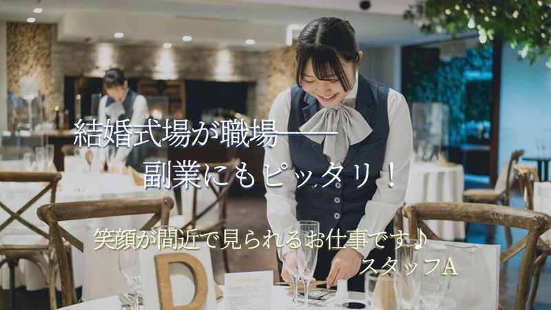 仕事内容 結婚式場でのお客様のおもてなし業務全般をお任せします。 <具体的には> ■お客様のお出迎え・ご案内 ■お荷物のお預かり ■挙式進行のサポート ■パーティ会場のセッティング ■パーティでの料理・お飲み物の配膳 などなど…周りの先輩スタッフがしっかりフォローするので、未経験スタートも安心です!