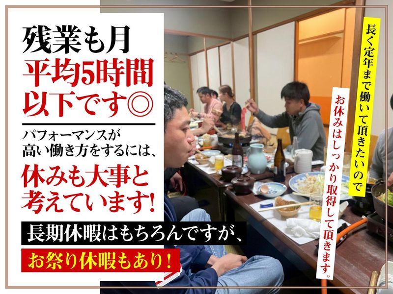 職場環境 ・従業員は釣り好きが多く定期的にみんなで釣りに行ってます ・現在スタッフは10代.20代.30代.40代.50代.60代活躍中 ・前職は大工、外構工事、土木作業員、リフォームなどの建設業界からの転職者も在籍中