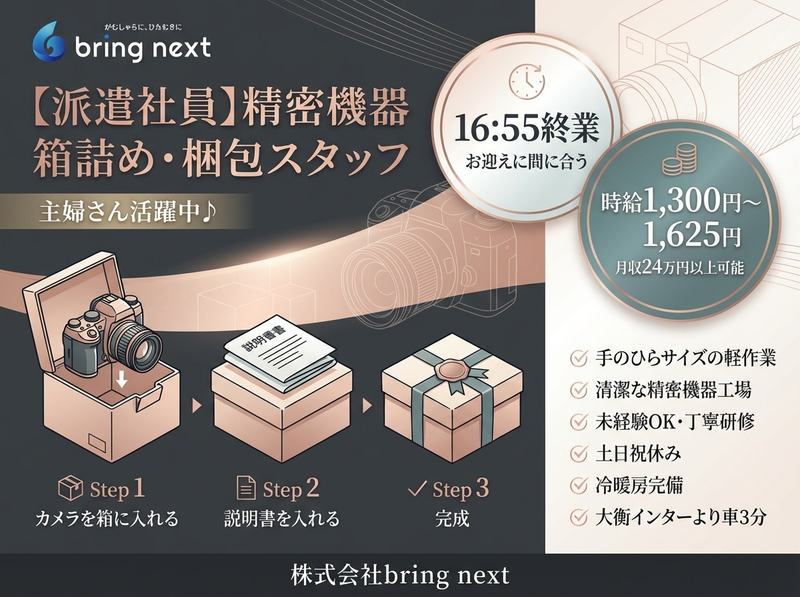 仕事内容 ▶まず一番の不安を解消します✨ 久しぶりの仕事で不安なのは当然です。 でも大丈夫です。 1つずつ順番に 教えてもらえます。 わからないことはすぐ確認できます。 工場が初めての方も問題なく活躍しています。 ▶16:55に退勤できます✨ 夕方からは 完全に自分の時間です。 土日祝はお休みです。 GW・お盆・年末年始の大型連休もあります。 生活リズムを整えながら続けられる環境です。 ▶「作業についていけるか」 判断が難しい作業はありません。 取り扱うのは手のひらサイズの軽量部品のみです。 重いものを持つ作業はほとんどありません。 一人でコツコツ進める工程が中心です。 ▶仕事の流れ 電子機器・精密機器に使われる 小型部品の製造工場でのお仕事です。 完成品に不具合がないか目で見て確認します。 傷・汚れ・ズレがないか 1つずつチェックします。 付随作業として 小型部品のセットや 袋・箱への収納もあります。 すべてシンプルな 作業内容です。 ▶オススメポイント✨ ブランクがあっても問題なくスタートできます。 「安定した職場で 長く働きたい」 という方に 向いているお仕事です。 ▶待遇 時給1,300円です。 8:30〜16:55の日勤です。 実働7時間40分・休憩45分。 土日祝休み・週休2日制。 大型連休あります。 - お仕事が始まったあとも、bring nextの担当スタッフが最低でも月2回ほど職場にお伺いしてサポートします。 困ったことや悩みごとは、すぐに相談できる環境です。 「派遣は初めて…」という方も、安心してスタートできますよ!