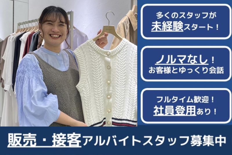 求めている人材 ◆経験不問 ◆未経験歓迎 ◆長期勤務歓迎 ◆フルタイム歓迎 ◤こんな方にオススメ◢ ◆ファッション好き・興味がある方 ◆人と話すのが好きな方 ◆接客業の経験がある方 ◆明るく丁寧にお客様と 接することができる方 ◆チームワークを大切にできる方