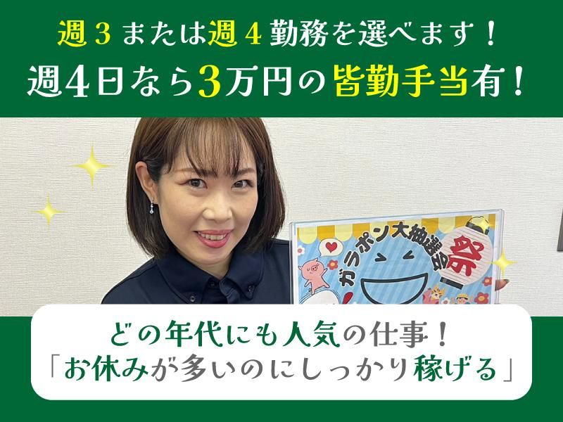 仕事内容 / お話し好きな方必見のお仕事! 研修&仲間のフォローで 未経験からでもしっかり稼げます! \ 【 お任せするのはこんなお仕事 】 ホームセンターコメリ内で ガラポン抽選会のイベントを開催して、 当社が扱う省エネ製品を知ってもらうお仕事です。 抽選会後、光熱費に関する簡単な アンケートをおこない、興味を持って くださった方には、お家の下見の 予約を取っていただきます。 もっと詳しく知りたい、そんなお客様には、 営業がバトンタッチして説明しますので、 難しい話をする必要はなし! 光熱費が上がっている、 そんなニュースもある中で、 電気代がお得になる省エネ商品に 興味を持っていただける お客様も今、多いんです! 「へー!知らなかった!」 「教えてくれてありがとう!」 なんて感謝される場面も たくさんあります! < お仕事の流れ > 事務所に集合して、複数名の チームで近郊のホームセンターへ 向かいます。現地で準備をしたら、 お仕事スタート!! ご来店頂いたお客様へアンケートを 取って頂いたり、ガラポン抽選会の 案内をして頂きます。 基本的に、催事があるのは土日のみ。 平日は事務所で準備をしたり 研修をしたりします。 【 未経験でも問題なし!】 丁寧に研修をおこないますので、 経験も知識も一切必要ありません! 催事中に困ったことがあっても 必ずベテランスタッフが待機していて、 すぐにフォローに駆けつけてくれます! 【 頑張った分だけ稼げる!】 あなたがお客様とお約束をとって 営業が成約すれば、1件につき5万円の 成果報酬が支給されます。 元気に明るく声掛けすればするほど お給料はどんどんアップ! お話を楽しみながら、しっかり稼げる そんなお仕事なんです! 【勤務スタイルを選択できます】 ※土日祝に入れる方の募集です。 <勤務スタイル(1)> 木金土日祝の中で、回数を相談。 週1~OK(ただし土日祝のいずれかを含む) 時給/1200円~1500円 ※成約数により変動 <勤務スタイル(2)※曜日固定> 最低週4日勤務…木金曜は研修 土日祝は催事 時給/1200円~1500円 ※成約数により変動 プラス歩合/50000円/件数 皆勤手当て/30000円 <勤務スタイル(3)※曜日固定>※営業経験者 週3日勤務…金曜は研修 土日祝は催事 時給/1300円~1500円 ※成約数により変動 プラス歩合/50000円/件数 【短期もOK】 「初めてで不安」という方や 「とりあえず試してみたい」 という方は、短期でもOK! 期間は気軽にご相談下さい。 その後の、長期希望も もちろん大歓迎です。 ◆◆◆◆◆◆◆◆◆◆◆◆◆ 販売や接客などをされていた方 にも人気のお仕事です。 家電量販店・携帯ショップなどで イベント経験のある方も 高時給や高率歩合で大満足してくれています。 ー こんな人たちが大活躍中!! ー ・学校がお休みの週末だけ 勤務の学生さん ・他のお仕事と調整して賢く 稼ぐWワークさん ・毎週は厳しいけど月の半分くらい 土日に働く主婦(夫)さん ・ここだけでしっかり稼ぐ フリーターさん 生活スタイルに合わせてサクッと 働きながら、高収入もGETできます◎