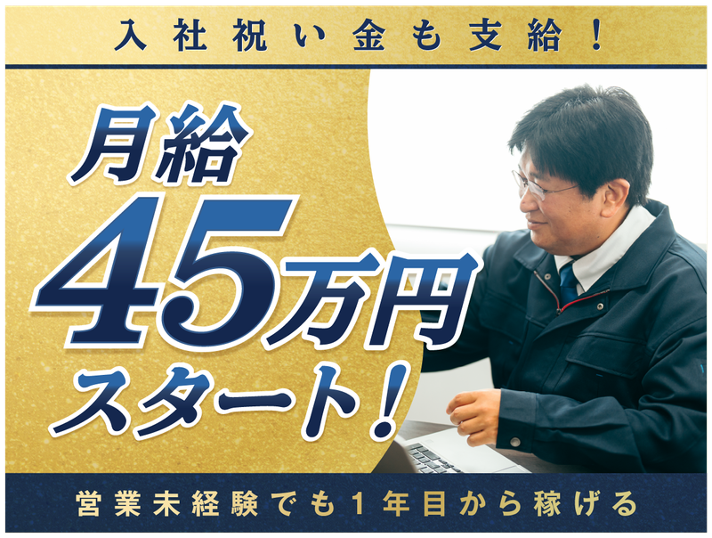 月給450,000円~1,000,000円 給与詳細 ※基本給・固定残業代・一律手当の総額 基本給:月給 25万5000円 〜 80万5000円 固定残業代:あり 1ヶ月あたり5万円(固定残業時間:1ヶ月あたり20時間) 固定残業時間を超えた勤務時間については別途残業代を支給する 【一律手当】 全員に一律で支払われる通勤・皆勤・家族手当金額:なし 全員に一律で支払われるその他手当金額:あり 1ヶ月あたり14万5000円 ※精勤手当14万5000円は1ヶ月目のみ ~給与詳細~ *入社1カ月目 └月収45万円(月給30万5000円+精勤手当14万5000円)+オーダー賞(成約1件につき5000円) *入社2カ月目 └月収30万5000円+高額歩合給+オーダー賞 *3ヶ月目 └月収48万5000円(月給30万5000円+入社祝い金18万円)+高額歩合給+オーダー賞 *4ヶ月目以降 └月給30万5000円+高額歩合給+オーダー賞 入社2カ月目から歩合の還元率がアップ! 早い段階から成果に応じてしっかり稼げます! 【給与例】 給与例 【年収例】 1100万円/入社4年(月給36万円+報奨金) 720万円/入社3年(月給34万円+報奨金) 650万円/入社1年(月給30万5000円+報奨金←未経験入社初年度例) 経験や年齢関係なく、成果を平等に還元する風土です! 【その他】 <本数達成賞(歩合給)あり> 1件受注するごとに支給 ※業績により報酬はさらに高額になります ※2ヶ月目以降は本数達成賞が2倍! <入社祝い金最大138万円支給> 入社3ヶ月目に入社祝金18万円を支給。後に 6ヶ月間の業績に応じ、最大120万円の祝金を支給。 ※初年度の年収例に入社祝金は含まれていません。 <高収入・高額ワーク> 歩合給あり+インセンティブあり!